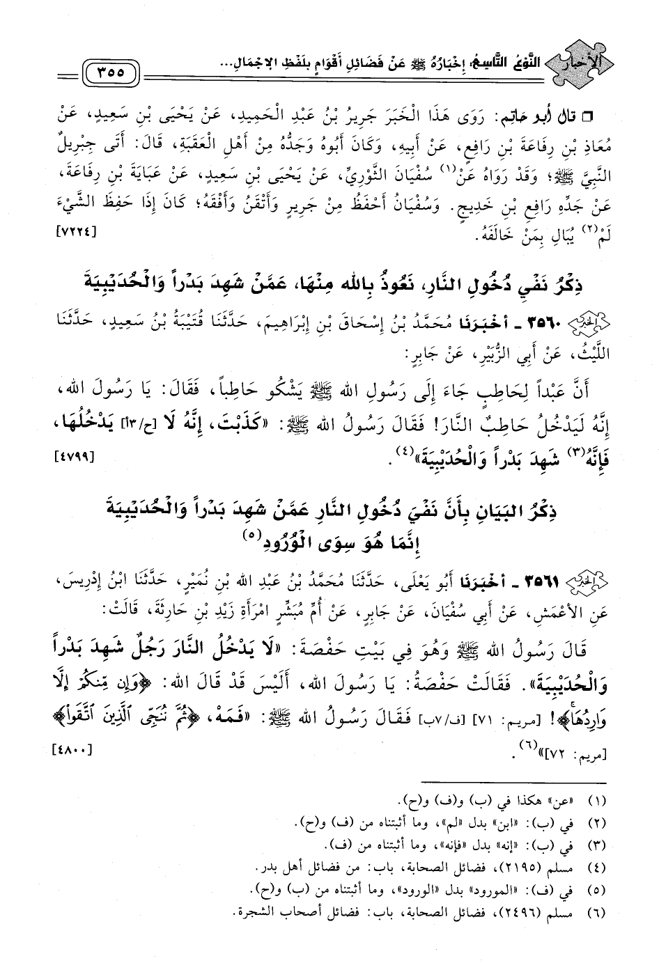 ذِكْرُ نَفْيِ دُخُولِ النَّارِ نَعُوذُ بِاللهِ مِنْهَا عَمَّنْ شَهِدَ بَدْرًا وَالْحُدَيْبِيَةَ.