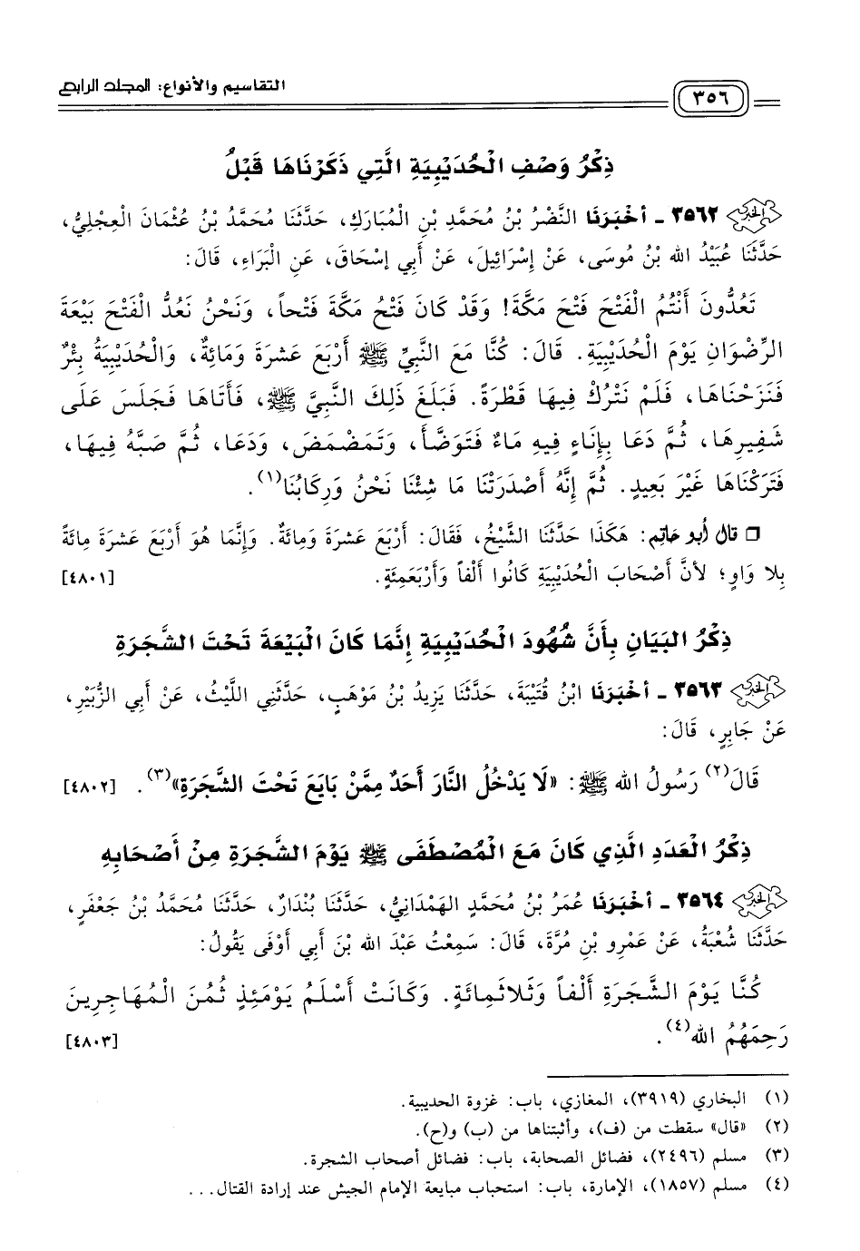 قَالَ أَبُو حَاتِمٍ: هَكَذَا حَدثنا الشَّيْخُ، فَقَالَ: أَرْبَعَ عَشْرَةَ وَمِائَةً، وَإِنَّمَا هُوَ أَرْبَعَ عَشْرَةَ مِائَةً، بِلَا وَاوٍ لأَنَّ أَصْحَابَ الْحُدَيْبِيَةِ كَانُوا أَلْفًا وَأَرْبَعَمِئَةٍ. [٤٨٠١]