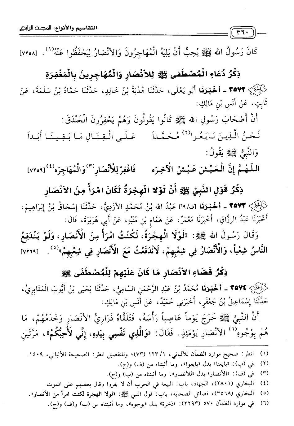 ٣٥٧٤ - أَخبَرنا مُحَمَّدُ بْنُ عَبْدِ الرَّحْمَنِ السَّامِيُّ، حَدثنا يَحْيَى بْنُ أَيُّوبَ الْمَقَابِرِيُّ، حَدثنا إِسْمَاعِيلُ بْنُ جَعْفَرٍ، أَخْبَرَنِي حُمَيْدٌ، عَنْ أَنَسِ بْنِ مَالِكٍ؛ أَنَّ النَّبِيَّ صَلى الله عَلَيه وسَلم خَرَجَ يَوْمًا عَاصِبًا رَأْسَهُ، فَتَلَقَّاهُ ذَرَارِيُّ الأَنْصَارِ وَخَدَمُهُمْ مَا هُمْ بِوجُوهِ الأَنْصَارِ يَوْمَئِذٍ، فَقَالَ: "وَالَّذِي نَفْسِي بِيَدِهِ إِنِّي لأُحِبُّكُمْ"، مَرَّتَيْنِ أَوْ ثَلَاثًا، ثُمَّ قَالَ: "إِنَّ الأَنْصَارَ قَدْ قَضَوا الَّذِي عَلَيْهِمْ وَبَقِيَ الَّذِي عَلَيْكُمْ، فَأَحْسِنُوا إِلَى مُحْسِنِهِمْ وَتَجَاوَزُوا عَنْ مُسِيئِهِمْ". [٧٢٦٦]
