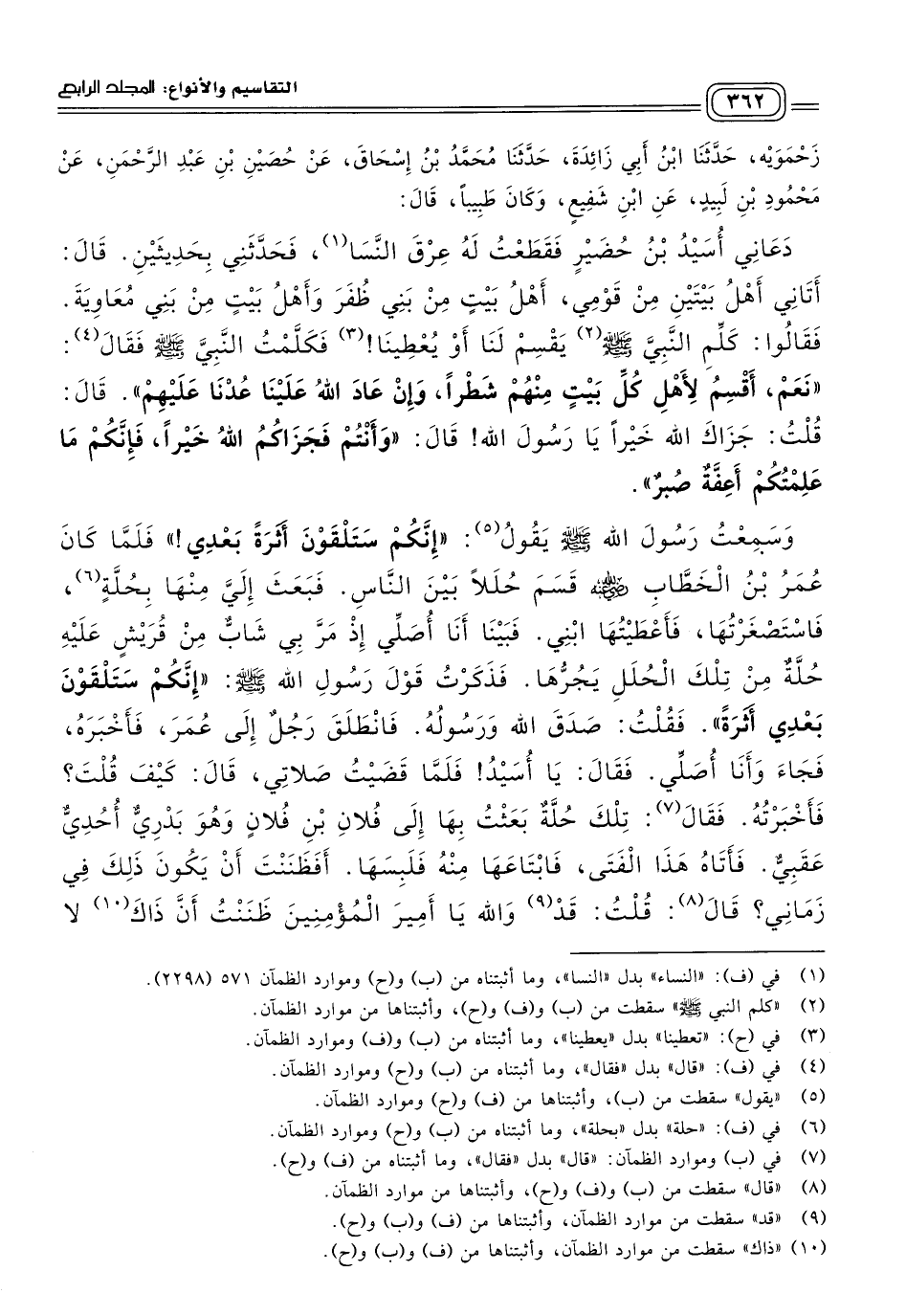 وَسَمِعْتُ رَسُولَ اللهِ صَلى الله عَلَيه وسَلم يَقُولُ: "إِنَّكُمْ سَتَلْقَوْنَ أَثَرَةً بَعْدِي"، فَلَمَّا كَانَ عُمَرُ بْنُ الْخَطَّابِ رَضِيَ اللهُ عَنْهُ قَسَمَ حُلَلاً بَيْنَ النَّاسِ، فَبَعَثَ إِلَيَّ مِنْهَا بِحُلَّةٍ، فَاسْتَصْغَرْتُهَا، فَأَعْطَيْتُهَا ابْنِي، فَبَيْنَا أَنَا أُصَلِّي إِذْ مَرَّ بِي شَابٌّ مِنْ قُرَيْشٍ عَلَيْهِ حُلَّةٌ مِنْ تِلْكَ الْحُلَلِ يَجُرُّهَا، فَذَكَرْتُ قَوْلَ رَسُولِ اللهِ صَلى الله عَلَيه وسَلم: "إِنَّكُمْ سَتَلْقَوْنَ بَعْدِي أَثَرَةً"، فَقُلْتُ: صَدَقَ اللهُ وَرَسُولُهُ، فَانْطَلَقَ رَجُلٌ إِلَى عُمَرَ، فَأَخْبَرَهُ، فَجَاءَ وَأَنَا أُصَلِّي، فَقَالَ: يَا أُسَيْدُ، فَلَمَّا قَضَيْتُ صَلَاتِي، قَالَ: كَيْفَ قُلْتَ؟ فَأَخْبَرْتُهُ، فَقَالَ: تِلْكَ حُلَّةٌ بَعَثْتُ بِهَا إِلَى فُلَانِ بْنِ فُلَانٍ وَهُوَ بَدْرِيٌّ أُحُدِيٌّ عَقَبِيٌّ، فَأَتَاهُ هَذَا الْفَتَى، فَابْتَاعَهَا مِنْهُ فَلَبِسَهَا، أَفَظَنَنْتَ أَنْ يَكُونَ ذَلِكَ فِي زَمَانِي؟ قال: قُلْتُ: قَدْ وَاللهِ يَا أَمِيرَ الْمُؤْمِنِينَ ظَنَنْتُ أَنَّ ذَاكَ لَا يَكُونُ فِي زَمَانِكَ. [٧٢٧٩]