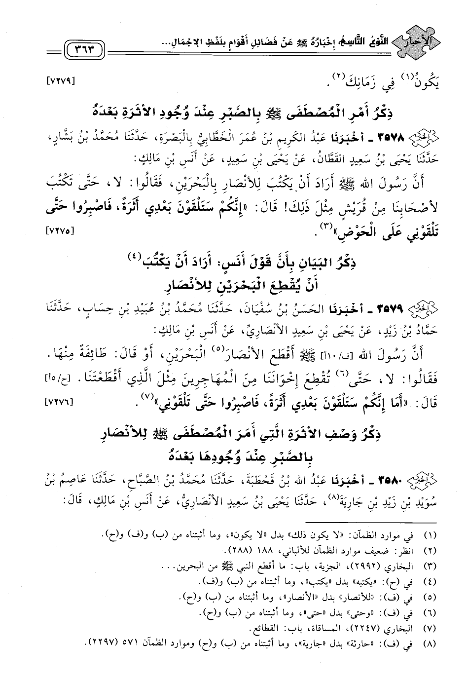 ٣٥٧٩ - أَخبَرنا الْحَسَنُ بْنُ سُفْيَانَ، حَدثنا مُحَمَّدُ بْنُ عُبَيْدِ بْنِ حِسَابٍ، حَدثنا حَمَّادُ بْنُ زَيْدٍ، عَنْ يَحْيَى بْنِ سَعِيدٍ الأَنْصَارِيِّ، عَنْ أَنَسِ بْنِ مَالِكٍ؛ أَنَّ رَسُولَ اللهِ صَلى الله عَلَيه وسَلم أَقْطَعَ الأَنْصَارَ الْبَحْرَيْنِ، أَوْ قَالَ: طَائِفَةً مِنْهَا، فَقَالُوا: لَا، حَتَّى تُقْطِعَ إِخْوَانَنَا مِنَ الْمُهَاجِرِينَ مِثْلَ الَّذِي أَقْطَعْتَنَا، قَالَ: "أَمَا إِنَّكُمْ سَتَلْقَوْنَ بَعْدِي أَثَرَةً، فَاصْبِرُوا حَتَّى تَلْقَوْنِي". [٧٢٧٦]