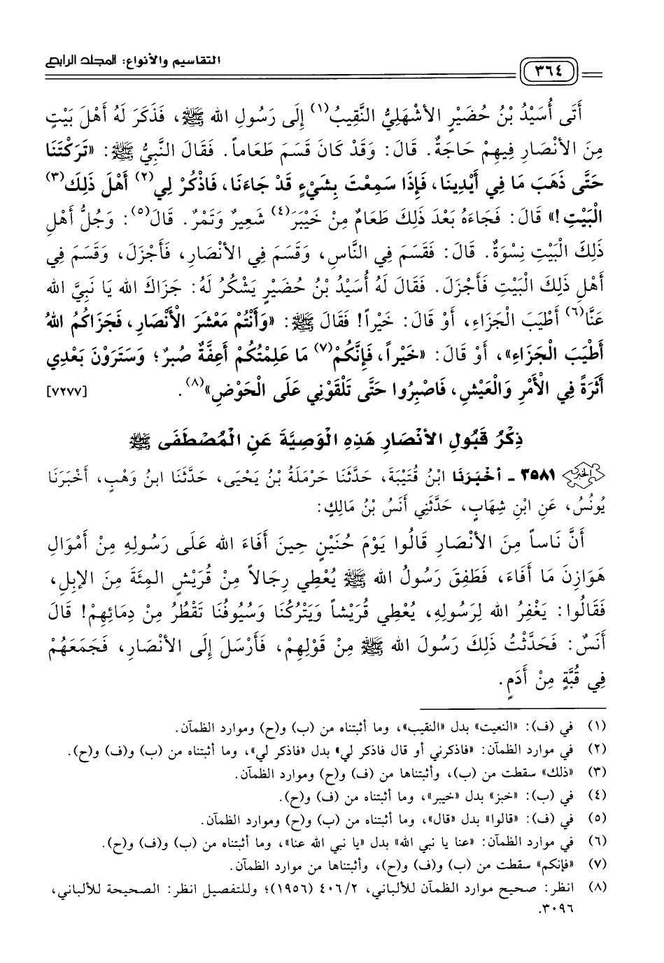 ٣٥٨١ - أَخبَرنا ابْنُ قُتَيْبَةَ، حَدثنا حَرْمَلَةُ بْنُ يَحْيَى، حَدثنا ابْنُ وَهْبٍ، أَخبَرنا يُونُسُ، عَنِ ابْنِ شِهَابٍ، حَدَّثَنِي أَنَسُ بْنُ مَالِكٍ؛ أَنَّ نَاسًا مِنَ الأَنْصَارِ قَالُوا يَوْمَ حُنَيْنٍ حِينَ أَفَاءَ اللهُ عَلَى رَسُولِهِ مِنْ أَمْوَالِ هَوَازِنَ مَا أَفَاءَ، فَطَفِقَ رَسُولُ اللهِ صَلى الله عَلَيه وسَلم يُعْطِي رِجَالاً مِنْ قُرَيْشٍ الْمِئَةَ مِنَ الإِبِلِ، فَقَالُوا: يَغْفِرُ اللهُ لِرَسُولِهِ يُعْطِي قُرَيْشًا وَيَتْرُكُنَا وَسُيُوفُنَا تَقْطُرُ مِنْ دِمَائِهِمْ، قَالَ أَنَسٌ: فَحَدَّثْتُ ذَلِكَ رَسُولَ اللهِ صَلى الله عَلَيه وسَلم مِنْ قَوْلِهِمْ، فَأَرْسَلَ إِلَى الأَنْصَارِ فَجَمَعَهُمْ فِي قُبَّةٍ مِنْ أَدَمٍ، فَلَمَّا اجْتَمَعُوا جَاءَهُمْ رَسُولُ اللهِ صَلى الله عَلَيه وسَلم، فَقَالَ: "مَا حَدِيثٌ بَلَغَنِي عَنْكُمْ؟ " فَقَالَ لَهُ قَوْمٌ مِنَ الأَنْصَارِ: أَمَّا ذَوُو أَسْنَانِنَا يَا رَسُولَ اللهِ، فَلَمْ يَقُولُوا شَيْئًا، وَأَمَّا نَاسٌ مِنَّا حَدِيثٌ أَسْنَانُهُمْ، فَقَالُوا: يَغْفِرُ اللهُ لِرَسُولِهِ يُعْطِي أُنَاسًا وَسُيُوفُنَا تَقْطُرُ مِنْ دِمَائِهِمْ، فَقَالَ رَسُولُ اللهِ صَلى الله عَلَيه وسَلم: "إِنِّي أُعْطِي رِجَالاً حَدِيثِي عَهْدٍ بِالْكُفْرِ أَتَأَلَّفُهُمْ، أَفَلَا تَرْضَوْنَ أَنْ يَذْهَبَ النَّاسُ بِالأَمْوَالِ، وَتَرْجِعُونَ إِلَى رِحَالِكُمْ بِرَسُولِ اللهِ صَلى الله عَلَيه وسَلم؟ فَوَاللهِ لَمَا تَنْقَلِبُونَ بِهِ خَيْرٌ مِمَّا يَنْقَلِبُونَ"، فَقَالُوا: بَلَى يَا رَسُولَ اللهِ، قَدْ رَضِينَا، قَالَ: "فَإِنَّكُمْ سَتَجِدُونَ أَثَرَةً شَدِيدَةً، فَاصْبِرُوا حَتَّى تَلَقَوُا اللهَ وَرَسُولَهُ عَلَى الْحَوْضِ" قَالُوا: سَنَصْبِرُ. [٧٢٧٨]