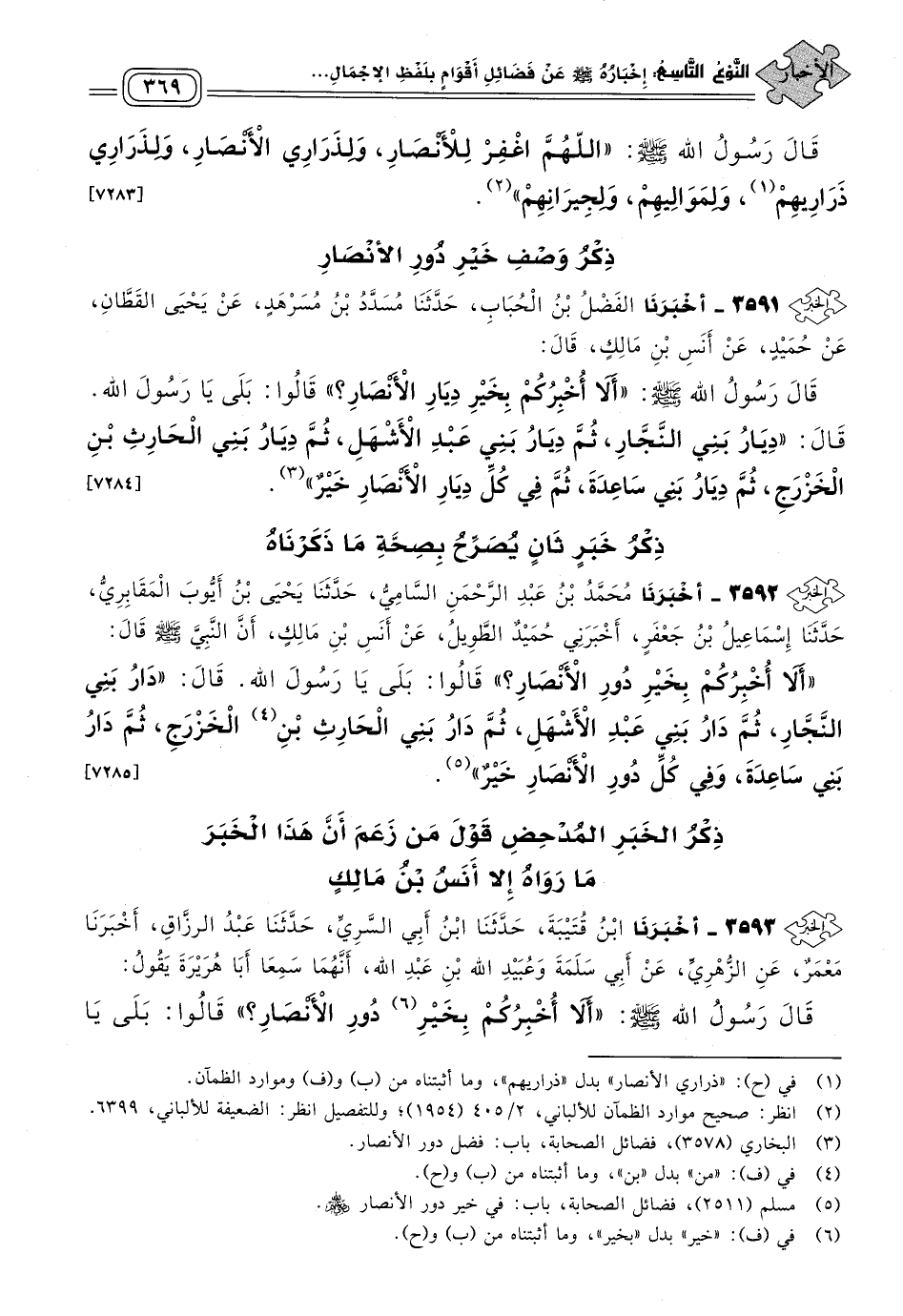 ٣٥٩١ - أَخبَرنا الْفَضْلُ بْنُ الْحُبَابِ، حَدثنا مُسَدَّدُ بْنُ مُسَرْهَدٍ، عَنْ يَحْيَى الْقَطَّانِ، عَنْ حُمَيْدٍ، عَنْ أَنَسِ بْنِ مَالِكٍ، قَالَ: قَالَ رَسُولُ اللهِ صَلى الله عَلَيه وسَلم: "أَلَا أُخْبِرُكُمْ بِخَيْرِ دِيَارِ الأَنْصَارِ؟ " قَالُوا: بَلَى يَا رَسُولَ اللهِ، قَالَ: "دِيَارُ بَنِي النَّجَّارِ، ثُمَّ دِيَارُ بَنِي عَبْدِ الأَشْهَلِ، ثُمَّ دِيَارُ بَنِي الْحَارِثِ بْنِ الْخَزْرَجِ، ثُمَّ دِيَارُ بَنِي سَاعِدَةَ، ثُمَّ فِي كُلِّ دِيَارِ الأَنْصَارِ خَيْرٌ". [٧٢٨٤]