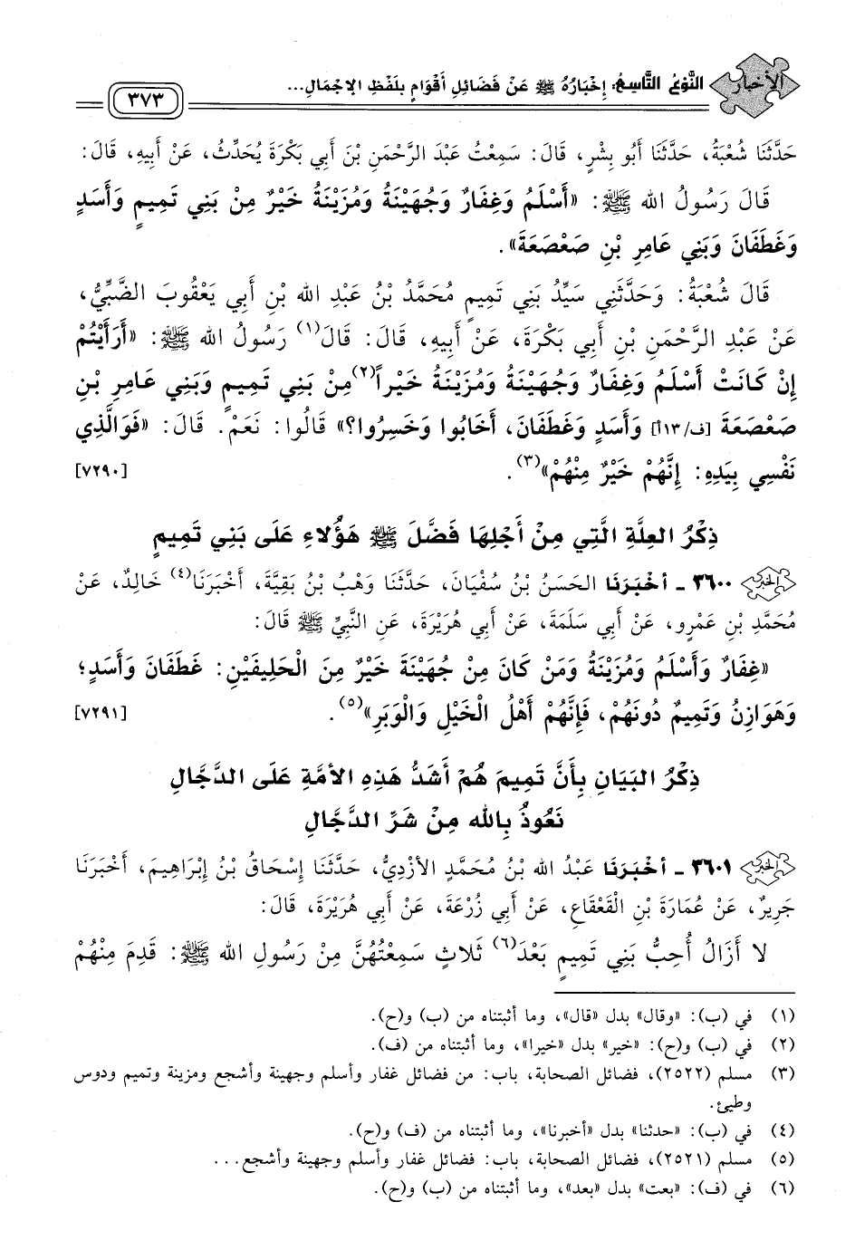 ٣٦٠١ - أَخبَرنا عَبْدُ اللهِ بْنُ مُحَمَّدٍ الأَزْدِيُّ، حَدثنا إِسْحَاقُ بْنُ إِبْرَاهِيمَ، أَخبَرنا جَرِيرٌ، عَنْ عُمَارَةَ بْنِ الْقَعْقَاعِ، عَنْ أَبِي زُرْعَةَ، عَنْ أَبِي هُرَيْرَةَ، قَالَ: لَا أَزَالُ أُحِبُّ بَنِي تَمِيمٍ بَعْدَ ثَلَاثٍ سَمِعْتُهُنَّ مِنْ رَسُولِ اللهِ صَلى الله عَلَيه وسَلم: قَدِمَ مِنْهُمْ سَبْيٌ عَلَى رَسُولِ اللهِ صَلى الله عَلَيه وسَلم، وَكَانَ عَلَى بَعْضِهِمْ رَقَبَةٌ مِنْ بَنِي إِسْمَاعِيلَ، فَقَالَ رَسُولُ اللهِ صَلى الله عَلَيه وسَلم: "أَعْتِقْهَا، فَإِنَّهَا مِنْ وَلَدِ إِسْمَاعِيلَ"، وَجَاءَتْهُ صَدَقَاتُ بَنِي تَمِيمٍ، فَقَالَ رَسُولُ اللهِ صَلى الله عَلَيه وسَلم: "هَذِهِ صَدَقَاتُ قَوْمِنَا"، وَسَمِعْتُهُ يَقُولُ: "هُمْ أَشَدُّ أُمَّتِي عَلَى الدَّجَّالِ". [٦٨٠٨]