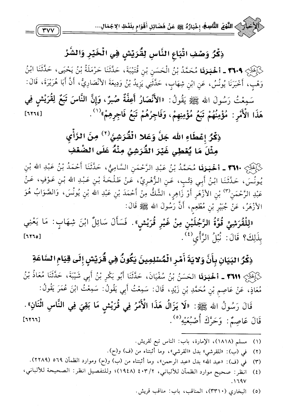 ذِكْرُ الْبَيَانِ بِأَنَّ وِلَايَةَ أَمْرِ الْمُسْلِمِينَ يَكُونُ فِي قُرَيْشٍ إِلَى قِيَامِ السَّاعَةِ.