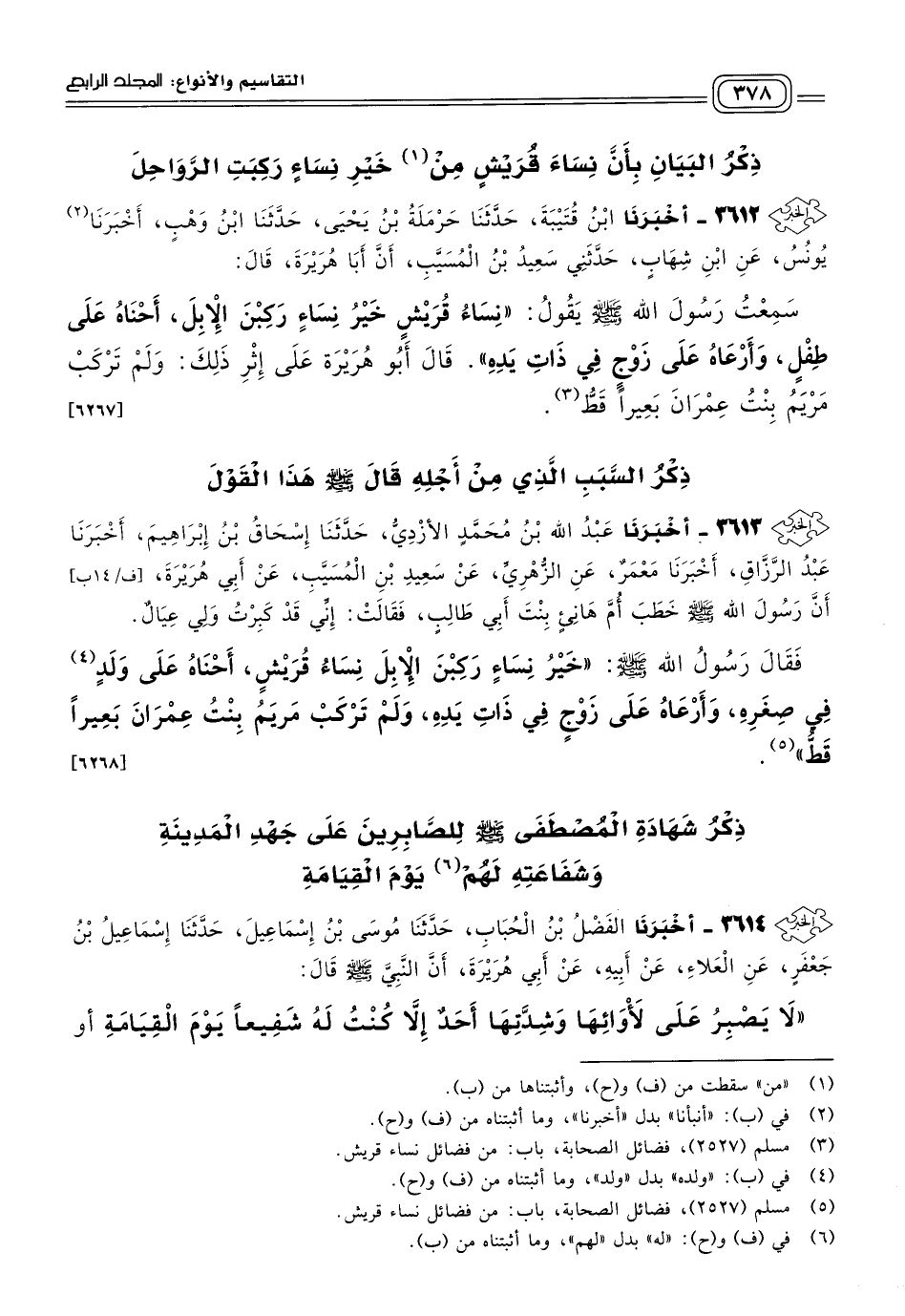٣٦١٢ - أَخبَرنا ابْنُ قُتَيْبَةَ، حَدثنا حَرْمَلَةُ بْنُ يَحْيَى، حَدثنا ابْنُ وَهْبٍ، أخبرنا يُونُسُ، عَنِ ابْنِ شِهَابٍ، حَدَّثَنِي سَعِيدُ بْنُ الْمُسَيَّبِ، أَنَّ أَبَا هُرَيْرَةَ، قَالَ: سَمِعْتُ رَسُولَ اللهِ صَلى الله عَلَيه وسَلم يَقُولُ: "نِسَاءُ قُرَيْشٍ خَيْرُ نِسَاءٍ رَكِبْنَ الإِبِلَ، أَحْنَاهُ عَلَى طِفْلٍ، وَأَرْعَاهُ عَلَى زَوْجٍ فِي ذَاتِ يَدِهِ".