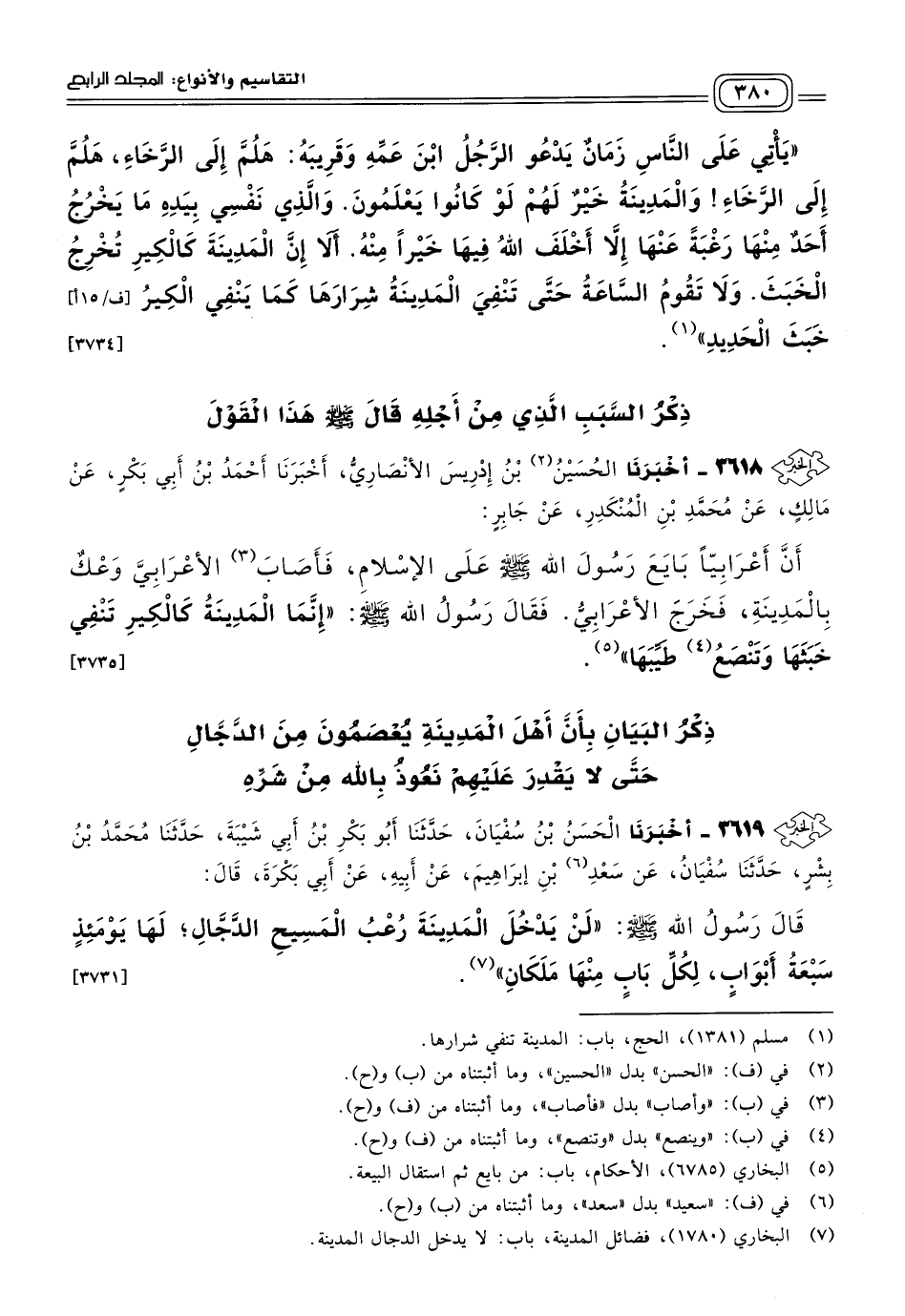 ٣٦١٨ - أَخبَرنا الْحُسَيْنُ بْنُ إِدْرِيسَ الأَنْصَارِيُّ، أَخبَرنا أَحْمَدُ بْنُ أَبِي بَكْرٍ، عَنْ مَالِكٍ، عَنْ مُحَمَّدِ بْنِ الْمُنْكَدِرِ، عَنْ جَابِرٍ، أَنَّ أَعْرَابِيًّا بَايَعَ رَسُولَ اللهِ صَلى الله عَلَيه وسَلم عَلَى الإِسْلَامِ، فَأَصَابَ الأَعْرَابِيَّ وَعْكٌ بِالْمَدِينَةِ، فَخَرَجَ الأَعْرَابِيُّ، فَقَالَ رَسُولُ اللهِ صَلى الله عَلَيه وسَلم: "إِنَّمَا الْمَدِينَةُ كَالْكِيرِ تَنْفِي خَبَثَهَا وَتَنْصَعُ طَيِّبَهَا". [٣٧٣٥]