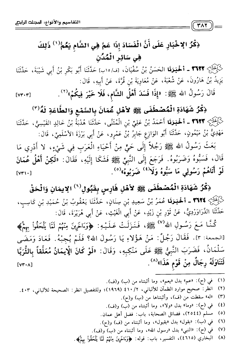 ٣٦٢٢ - أَخبَرنا الْحَسَنُ بْنُ سُفْيَانَ، حَدثنا أَبُو بَكْرِ بْنُ أَبِي شَيْبَةَ، حَدثنا يَزِيدُ بْنُ هَارُونَ، عَنْ شُعْبَةَ، عَنْ مُعَاوِيَةَ بْنِ قُرَّةَ، عَنْ أَبِيهِ، قَالَ: قَالَ رَسُولُ اللهِ صَلى الله عَلَيه وسَلم: "إِذَا فَسَدَ أَهْلُ الشَّامِ فَلَا خَيْرَ فِيكُمْ". [٧٣٠٣]