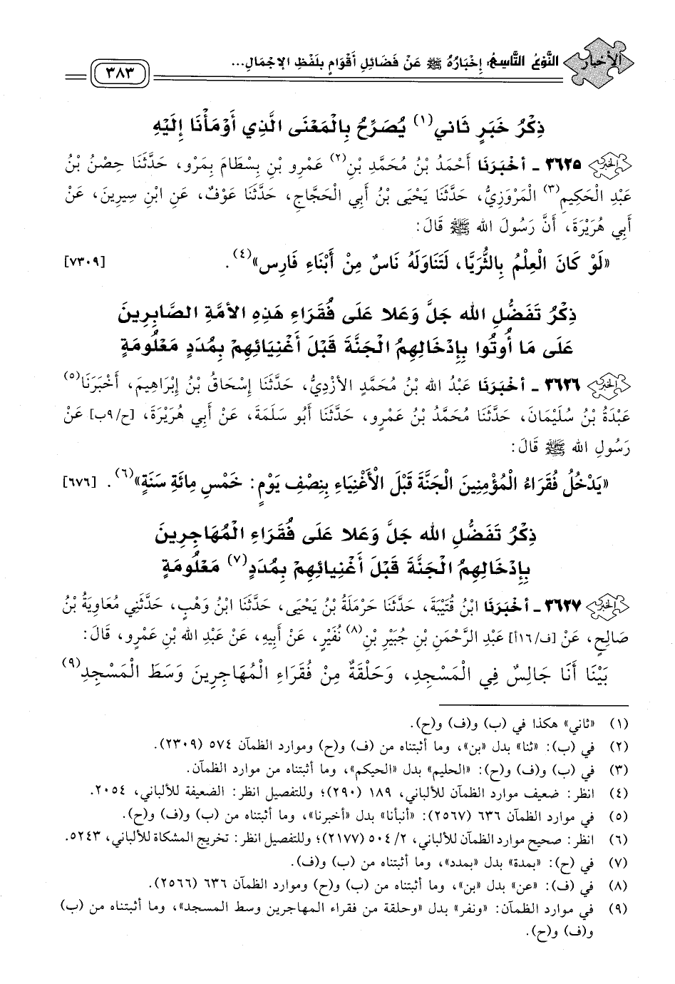 ٣٦٢٥ - أَخبَرنا أَحْمَدُ بْنُ مُحَمَّدِ بْنِ عَمْرِو بْنِ بِسْطَامٍ، بِمَرْوٍ، حَدثنا حِصْنُ بْنُ عَبْدِ الْحَكِيمِ الْمَرْوَزِيُّ، حَدثنا يَحْيَى بْنُ أَبِي الْحَجَّاجِ، حَدثنا عَوْفٌ، عَنِ ابْنِ سِيرِينَ، عَنْ أَبِي هُرَيْرَةَ، أَنَّ رَسُولَ اللهِ صَلى الله عَلَيه وسَلم، قَالَ: "لَوْ كَانَ الْعِلْمُ بِالثُّرَيَّا لَتَنَاوَلَهُ نَاسٌ مِنْ أَبْنَاءِ فَارِسٍ". [٧٣٠٩]