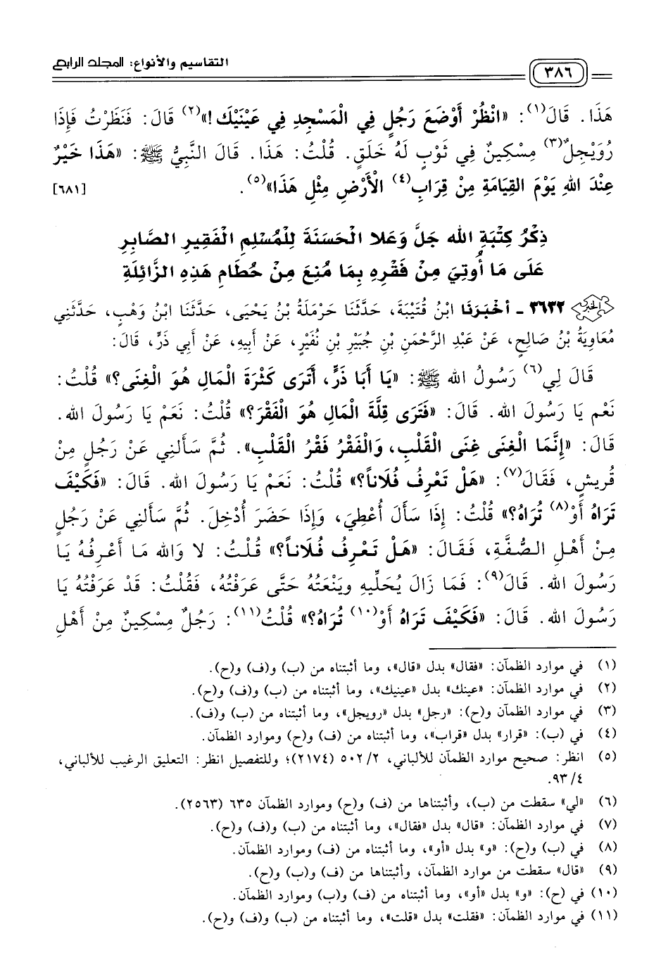 ٣٦٣٢ - أَخبَرنا ابْنُ قُتَيْبَةَ، حَدثنا حَرْمَلَةُ بْنُ يَحْيَى، حَدثنا ابْنُ وَهْبٍ، حَدَّثَنِي مُعَاوِيَةُ بْنُ صَالِحٍ، عَنْ عَبْدِ الرَّحْمَنِ بْنِ جُبَيْرِ بْنِ نُفَيْرٍ، عَنْ أَبِيهِ، عَنْ أَبِي ذَرٍّ قَالَ: قَالَ لي رَسُولُ اللهِ صَلى الله عَلَيه وسَلم: "يَا أَبَا ذَرٍّ أَتَرَى كَثْرَةَ الْمَالِ هُوَ الْغِنَى؟ " قُلْتُ: نَعَمْ يَا رَسُولَ اللهِ، قَالَ: "فَتَرَى قِلَّةَ الْمَالِ هُوَ الْفَقْرَ؟ " قُلْتُ: نَعَمْ يَا رَسُولَ اللهِ، قَالَ: "إِنَّمَا الْغِنَى غِنَى الْقَلْبِ، وَالْفَقْرُ فَقْرُ الْقَلْبِ"، ثُمَّ سَأَلَنِي عَنْ رَجُلٍ مِنْ قُرَيْشٍ، فقَالَ: "هَلْ تَعْرِفُ فُلَانًا؟ " قُلْتُ: نَعَمْ يَا رَسُولَ اللهِ، قَالَ: "فَكَيْفَ تَرَاهُ أَوْ تُرَاهُ؟ " قُلْتُ: إِذَا سَأَلَ أُعْطِيَ، وَإِذَا حَضَرَ أُدْخِلَ، ثُمَّ سَأَلَنِي عَنْ رَجُلٍ مِنْ أَهْلِ الصُّفَّةِ، فقَالَ: "هَلْ تَعْرِفُ فُلَانًا؟ " قُلْتُ: لَا وَاللهِ مَا أَعْرِفُهُ يَا رَسُولَ اللهِ، قَالَ: فَمَا زَالَ يُحَلِّيهِ وَيَنْعَتُهُ حَتَّى عَرَفْتُهُ، فَقُلْتُ: قَدْ عَرَفْتُهُ يَا رَسُولَ اللهِ، قَالَ: "فَكَيْفَ تَرَاهُ أَوْ تُرَاهُ؟ " قُلْتُ: رَجُلٌ مِسْكِينٌ مِنْ أَهْلِ الصُّفَّةِ، فقَالَ: "هُوَ خَيْرٌ مِنْ طِلَاعِ الأَرْضِ مِنَ الآخَرِ"، قُلْتُ: يَا رَسُولَ اللهِ، أَفَلَا يُعْطَى مِنْ بَعْضِ مَا يُعْطَى الآخَرُ؟ فقَالَ: "إِذَا أُعْطِيَ خَيْرًا فَهُوَ أَهْلُهُ، وَإِنْ صُرِفَ عَنْهُ فَقَدْ أُعْطِيَ حَسَنَةً". [٦٨٥]