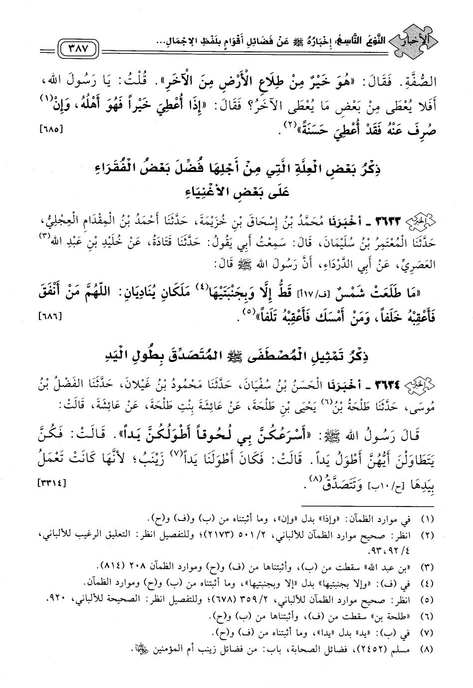٣٦٣٤ - أَخبَرنا الْحَسَنُ بْنُ سُفْيَانَ، حَدثنا مَحْمُودُ بْنُ غَيْلَانَ، حَدثنا الْفَضْلُ بْنُ مُوسَى، حَدثنا طَلْحَةُ بْنُ يَحْيَى بْنِ طَلْحَةَ، عَنْ عَائِشَةَ بِنْتِ طَلْحَةَ، عَنْ عَائِشَةَ، قَالَتْ: قَالَ رَسُولُ اللهِ صَلى الله عَلَيه وسَلم: "أَسْرَعُكُنَّ بِي لُحُوقًا أَطْوَلُكُنَّ يَدًا"، قَالَتْ: فَكُنَّ يَتَطَاوَلْنَ أَيُّهُنَّ أَطْوَلُ يَدًا، قَالَتْ: فَكَانَ أَطْوَلَنَا يَدًا زَيْنَبُ، لأَنَّهَا كَانَتْ تَعْمَلُ بِيَدِهَا وَتَتَصَدَّقُ. [٣٣١٤]