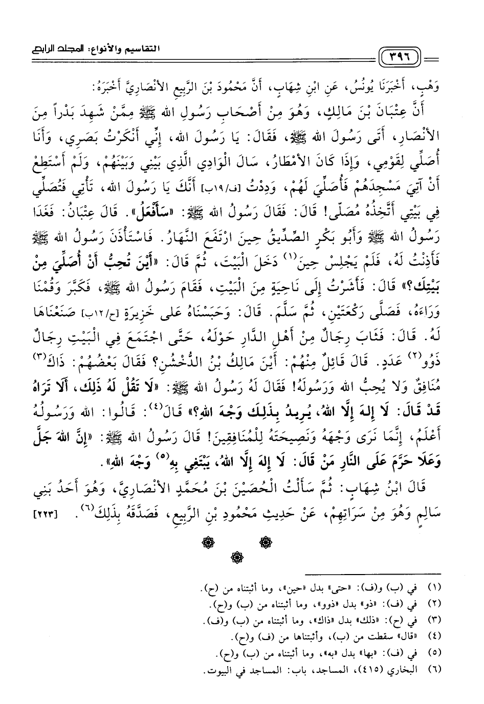 قَالَ: فَقَالَ رَسُولُ اللهِ صَلى الله عَلَيه وسَلم: "سَأَفْعَلُ". قَالَ عِتْبَانُ: فَغَدَا رَسُولُ اللهِ صَلى الله عَلَيه وسَلم وَأَبُو بَكْرٍ الصِّدِّيقُ حِينَ ارْتَفَعَ النَّهَارُ، فَاسْتَأْذَنَ رَسُولُ اللهِ صَلى الله عَلَيه وسَلم، فَأَذِنْتُ لَهُ، فَلَمْ يَجْلِسْ حين دَخَلَ الْبَيْتَ ثُمَّ قَالَ: "أَيْنَ تُحِبُّ أَنْ أُصَلِّيَ مِنْ بَيْتِكَ؟ " قَالَ: فَأَشَرْتُ إِلَى نَاحِيَةٍ مِنَ الْبَيْتِ، فَقَامَ رَسُولُ اللهِ صَلى الله عَلَيه وسَلم فَكَبَّرَ، وَقُمْنَا وَرَاءَهُ، فَصَلَّى رَكْعَتَيْنِ ثُمَّ سَلَّمَ، قَالَ: وَحَبَسْنَاهُ عَلَى خَزِيرَةٍ صَنَعْنَاهَا لَهُ، قَالَ: فَثَابَ رِجَالٌ مِنْ أَهْلِ الدَّارِ حَوْلَهُ، حَتَّى اجْتَمَعَ فِي الْبَيْتِ رِجَالٌ ذَوُو عَدَدٍ، قَالَ قَائِلٌ مِنْهُمْ: أَيْنَ مَالِكُ بْنُ الدُّخْشُنِ؟ فَقَالَ بَعْضُهُمْ: ذَاكَ مُنَافِقٌ، وَلَا يُحِبُّ اللهَ وَرَسُولَهُ، فَقَالَ لَهُ رَسُولُ اللهِ صَلى الله عَلَيه وسَلم: "لَا تَقُلْ لَهُ ذَلِكَ، أَلَا تَرَاهُ قَدْ قَالَ: لَا إِلَهَ إِلَاّ اللهُ، يُرِيدُ بِذَلِكَ وَجْهَ اللهِ؟ " قال: قَالُوا: اللهُ وَرَسُولُهُ أَعْلَمُ، إِنَّمَا نَرَى وَجْهَهُ وَنَصِيحَتَهُ لِلْمُنَافِقِينَ، قَالَ رَسُولُ اللهِ صَلى الله عَلَيه وسَلم: "إِنَّ اللهَ جَلَّ وَعَلَا حَرَّمَ عَلَى النَّارِ مَنْ قَالَ: لَا إِلَهَ إِلَاّ اللهُ، يَبْتَغِي بِهِ وَجْهَ اللهِ".