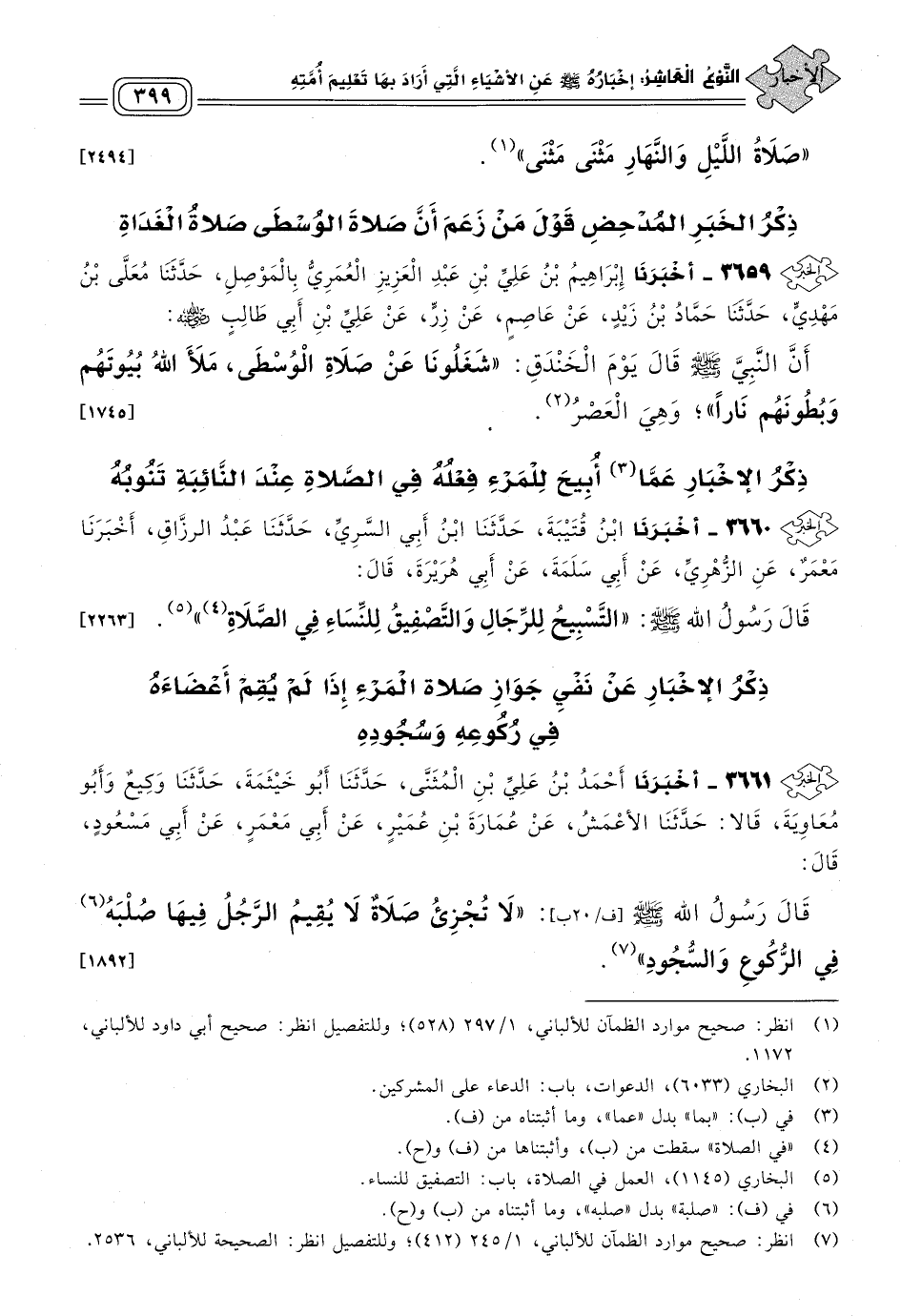 ٣٦٥٩ - أَخبَرنا إِبْرَاهِيمُ بْنُ عَلِيِّ بْنِ عَبْدِ الْعَزِيزِ الْعُمَرِيُّ، بِالْمَوْصِلِ، حَدثنا مُعَلَّى بْنُ مَهْدِيٍّ، حَدثنا حَمَّادُ بْنُ زَيْدٍ، عَنْ عَاصِمٍ، عَنْ زِرٍّ، عَنْ عَلِيِّ بْنِ أَبِي طَالِبٍ رَضِيَ اللهُ عَنْهُ أَنَّ النَّبِيَّ صَلى الله عَلَيه وسَلم قَالَ يَوْمَ الْخَنْدَقِ: "شَغَلُونَا عَنْ صَلَاةِ الْوُسْطَى، مَلأَ اللهُ بُيُوتَهُمْ وَبُطُونَهُمْ نَارًا"، وَهِيَ الْعَصْرُ. [١٧٤٥]