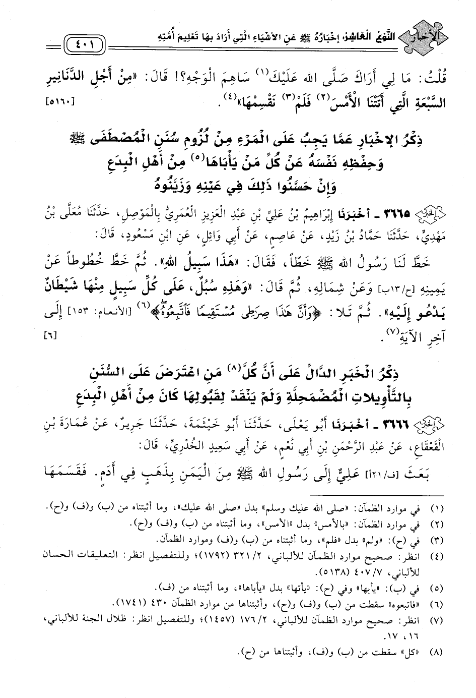 ٣٦٦٥ - أَخبَرنا إِبْرَاهِيمُ بْنُ عَلِيِّ بْنِ عَبْدِ الْعَزِيزِ الْعُمَرِيُّ بِالْمَوْصِلِ، حَدثنا مُعَلَّى بْنُ مَهْدِيٍّ، حَدثنا حَمَّادُ بْنُ زَيْدٍ، عَنْ عَاصِمٍ، عَنْ أَبِي وَائِلٍ، عَنِ ابْنِ مَسْعُودٍ، قَالَ: خَطَّ لَنَا رَسُولُ اللهِ صَلى الله عَلَيه وسَلم خَطًّا، فَقَالَ: "هَذَا سَبِيلُ اللهِ"، ثُمَّ خَطَّ خُطُوطًا عَنْ يَمِينِهِ وَعَنْ شِمَالِهِ، ثُمَّ قَالَ: "وَهَذِهِ سُبُلٌ، عَلَى كُلِّ سَبِيلٍ مِنْهَا شَيْطَانٌ يَدْعُو إِلَيْهِ"، ثُمَّ تَلَا: {وَأَنَّ هَذَا صِرَاطِي مُسْتَقِيمًا فَاتَّبِعُوهُ} [الأنعام: ١٥٣] إِلَى آخِرِ الآيَةِ. [٦]