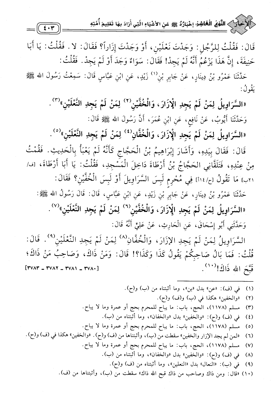 قَالَ: فَقَالَ بِيَدِهِ، وَأَشَارَ إِبْرَاهِيمُ بْنُ الْحَجَّاجِ، كَأَنَّهُ لَمْ يَعْبَأْ بِالْحَدِيثِ، فَقُمْتُ مِنْ عِنْدِهِ فَتَلَقَّانِي الْحَجَّاجُ بْنُ أَرْطَاةَ دَاخِلَ الْمَسْجِدِ، فَقُلْتُ: يَا أَبَا أَرْطَاةَ، مَا تَقُولُ فِي مُحْرِمٍ لَبِسَ السَّرَاوِيلَ، أَوْ لَبَسَ الْخُفَّيْنِ؟ فَقَالَ: حَدثنا عَمْرُو بْنُ دِينَارٍ، عَنْ جَابِرِ بْنِ زَيْدِ، عَنِ ابْنِ عَبَّاسٍ، قَالَ: قَالَ رَسُولُ اللهِ صَلى الله عَلَيه وسَلم: "السَّرَاوِيلُ لِمَنْ لَمْ يَجِدِ الإِزَارَ، وَالْخُفَّيْنِ لِمَنْ لَمْ يَجِدِ النَّعْلَيْنِ".