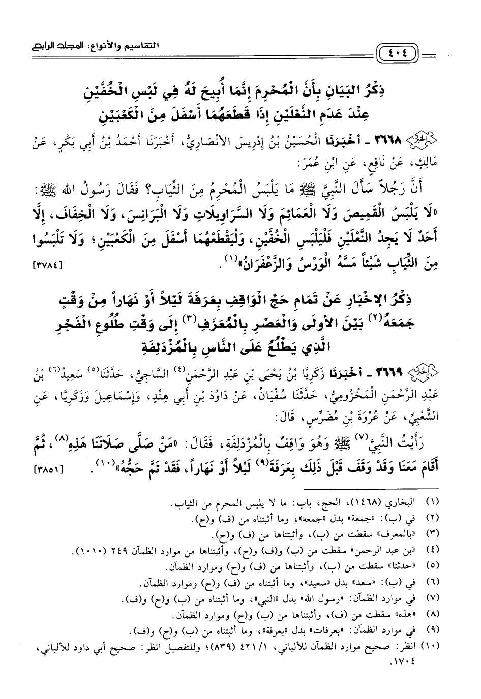 ٣٦٦٩ - أَخبَرنا زَكَرِيَّا بْنُ يَحْيَى بن عبد الرحمن السَّاجِيُّ، حَدثنا سَعِيدُ بْنُ عَبْدِ الرَّحْمَنِ الْمَخْزُومِيُّ، حَدثنا سُفْيَانُ، عَنْ دَاوُدَ بْنِ أَبِي هِنْدَ، وَإِسْمَاعِيلَ، وَزَكَرِيَّا، عَنِ الشَّعْبِيِّ، عَنْ عُرْوَةَ بْنِ مُضَرِّسٍ، قَالَ: رَأَيْتُ النَّبِيَّ صَلى الله عَلَيه وسَلم وَهُوَ وَاقِفٌ بِالْمُزْدَلِفَةِ، فَقَالَ: "مَنْ صَلَّى صَلَاتَنَا هَذِهِ، ثُمَّ أَقَامَ مَعَنَا وَقَدْ وَقَفَ قَبْلَ ذَلِكَ بِعَرَفَةَ لَيْلاً أَوْ نَهَارًا، فَقَدْ تَمَّ حَجُّهُ". [٣٨٥١]