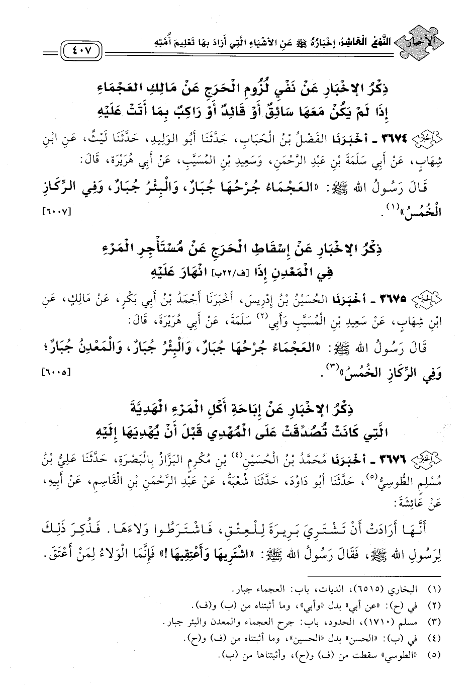 ٣٦٧٤ - أَخبَرنا الْفَضْلُ بْنُ الْحُبَابِ، حَدثنا أَبُو الْوَلِيدِ، حَدثنا لَيْثٌ، عَنِ ابْنِ شِهَابٍ، عَنْ أَبِي سَلَمَةَ بْنِ عَبْدِ الرَّحْمَنِ، وَسَعِيدِ بْنِ الْمُسَيَّبِ، عَنْ أَبِي هُرَيْرَةَ، قَالَ: قَالَ رَسُولُ اللهِ صَلى الله عَلَيه وسَلم: "الْعَجْمَاءُ جُرْحُهَا جُبَارٌ، وَالْبِئْرُ جُبَارٌ، وَفِي الرِّكَازِ الْخُمُسُ". [٦٠٠٧]