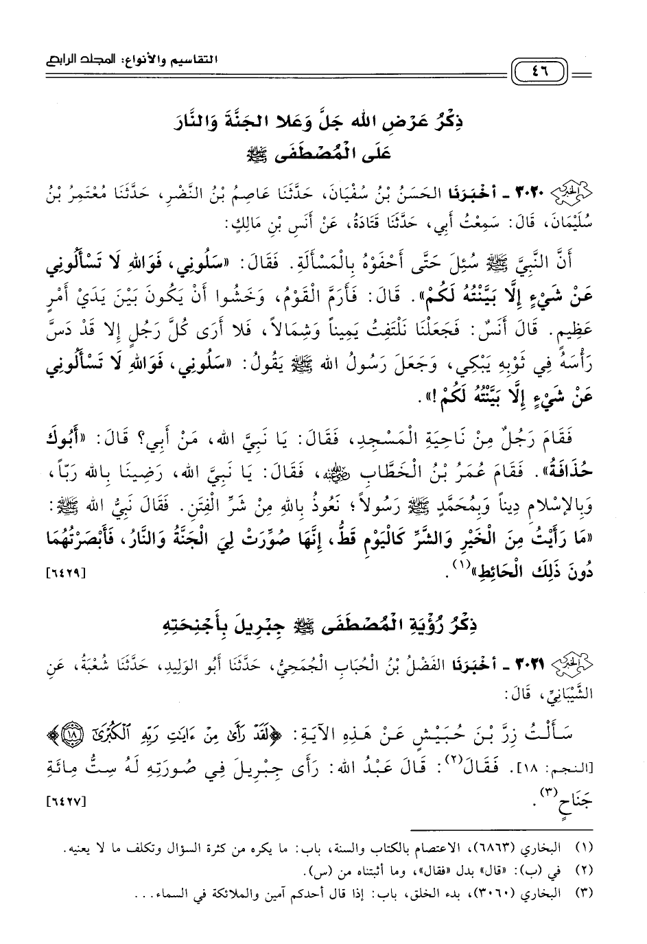 ٣٠٢١ - أَخبَرنا الْفَضْلُ بْنُ الْحُبَابِ الْجُمَحِيُّ، حَدثنا أَبُو الْوَلِيدِ، حَدثنا شُعْبَةُ، عَنِ الشَّيْبَانِيِّ، قَالَ: سَأَلْتُ زِرَّ بْنَ حُبَيْشٍ عَنْ هَذِهِ الآيَةِ: {لَقَدْ رَأَى مِنْ آيَاتِ رَبِّهِ الْكُبْرَى} [النجم: ١٨]. فَقَالَ: قَالَ عَبْدُ اللهِ: رَأَى جِبْرِيلَ فِي صُورَتِهِ لَهُ سِتُّ مِائَةِ جَنَاحٍ. [٦٤٢٧]