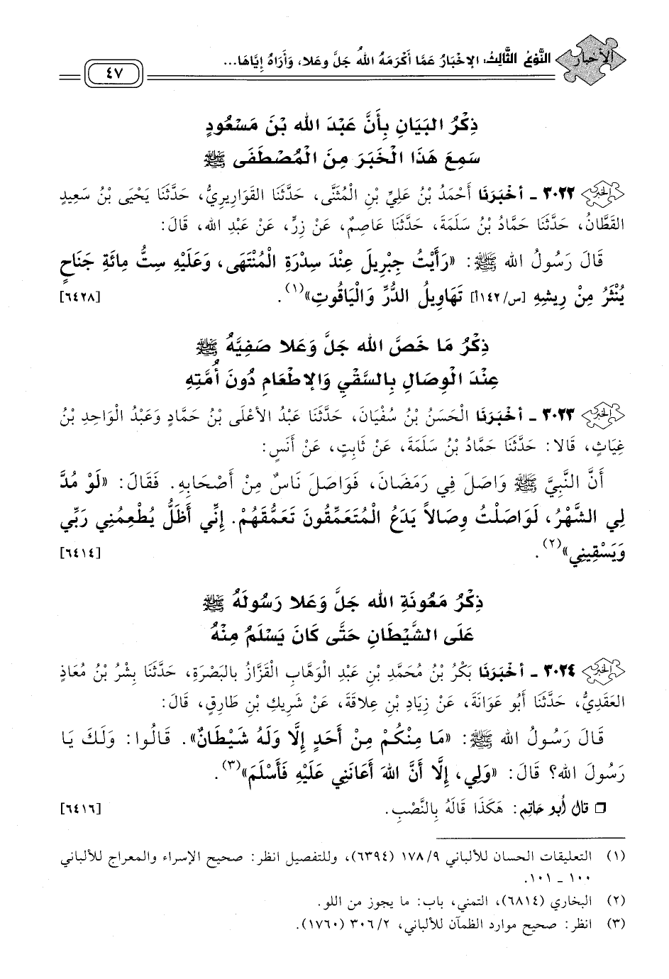 ٣٠٢٢ - أَخبَرنا أَحْمَدُ بْنُ عَلِيِّ بْنِ الْمُثَنَّى، حَدثنا الْقَوَارِيرِيُّ، حَدثنا يَحْيَى بْنُ سَعِيدٍ الْقَطَّانُ، حَدثنا حَمَّادُ بْنُ سَلَمَةَ، حَدثنا عَاصِمٌ، عَنْ زِرٍّ، عَنْ عَبْدِ اللهِ، قَالَ: قَالَ رَسُولُ اللهِ صَلى الله عَلَيه وسَلم: "رَأَيْتُ جِبْرِيلَ عِنْدَ سِدْرَةِ الْمُنْتَهَى، وَعَلَيْهِ سِتُّ مِائَةِ جَنَاحٍ يَنْثُرُ مِنْ رِيشِهِ تَهَاوِيلَ الدُّرِّ وَالْيَاقُوتِ". [٦٤٢٨]