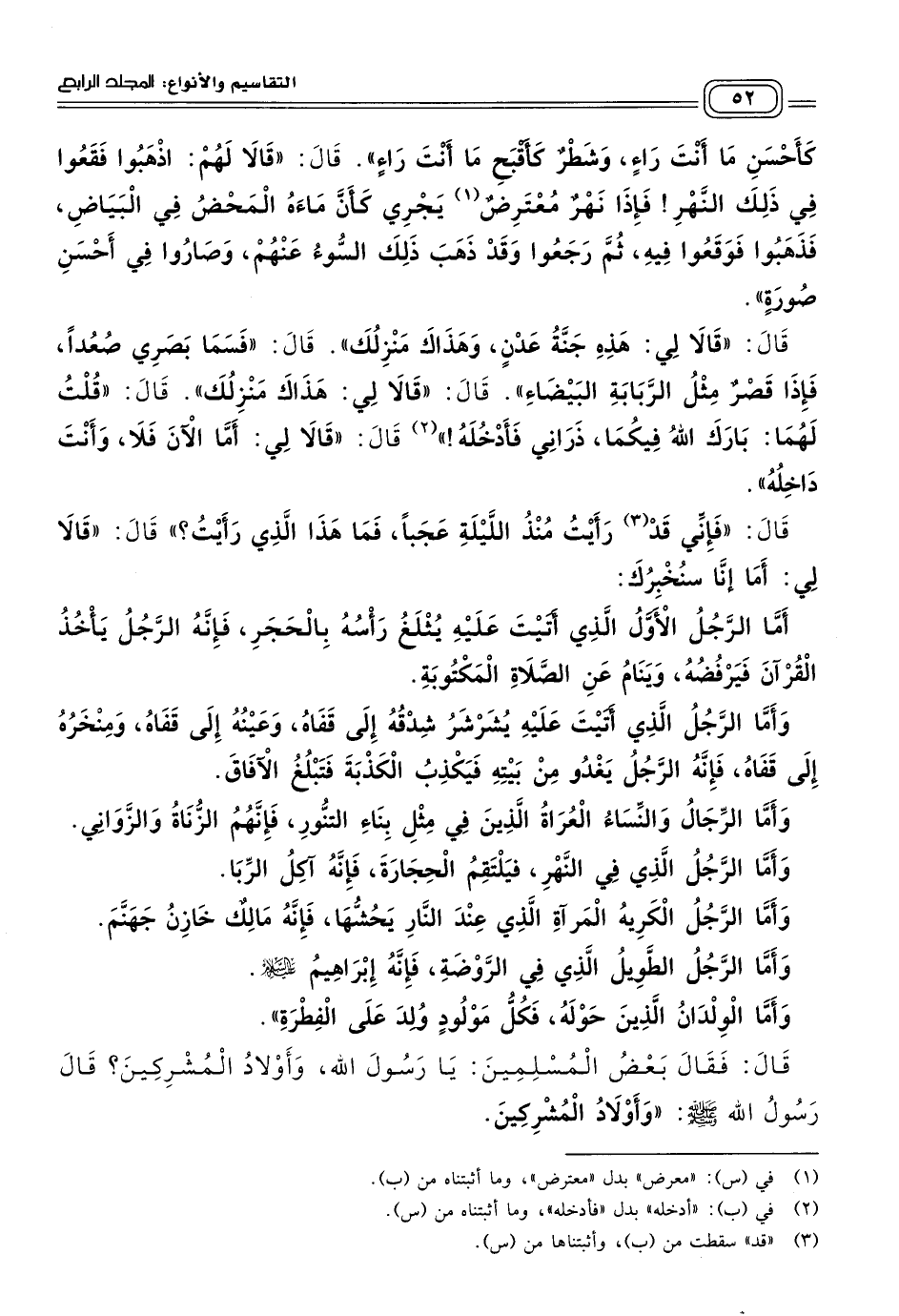 فَإِذَا نَهْرٌ مُعْتَرِضٌ يَجْرِي كَأَنَّ مَاءَهُ الْمَحْضُ فِي الْبَيَاضِ، فَذَهَبُوا فَوَقَعُوا فِيهِ، ثُمَّ رَجَعُوا وَقَدْ ذَهَبَ ذَلِكَ السُّوءُ عَنْهُمْ، وَصَارُوا فِي أَحْسَنِ صُورَةٍ"، قَالَ: "قَالَا لِي: هَذِهِ جَنَّةُ عَدْنٍ، وَهَذَاكَ مَنْزِلُكَ"، قَالَ: "فَسَمَا بَصَرِي صُعُدًا، فَإِذَا قَصْرٌ مِثْلُ الرَّبَابَةِ الْبَيْضَاءِ"، قَالَ: "قَالَا لِي: هَذَاكَ مَنْزِلُكَ"، قَالَ: "قُلْتُ لَهُمَا: بَارَكَ اللهُ فِيكُمَا، ذَرَانِي فأَدْخُلَهُ" قَالَ: "قَالَا لِي: أَمَّا الآنَ فَلَا، وَأَنْتَ دَاخِلُهُ". قَالَ: "فَإِنِّي قد رَأَيْتُ مُنْذُ اللَّيْلَةِ عَجَبًا، فَمَا هَذَا الَّذِي رَأَيْتُ؟ " قَالَ: "قَالَا لِي: أَمَا إِنَّا سَنُخْبِرُكَ.