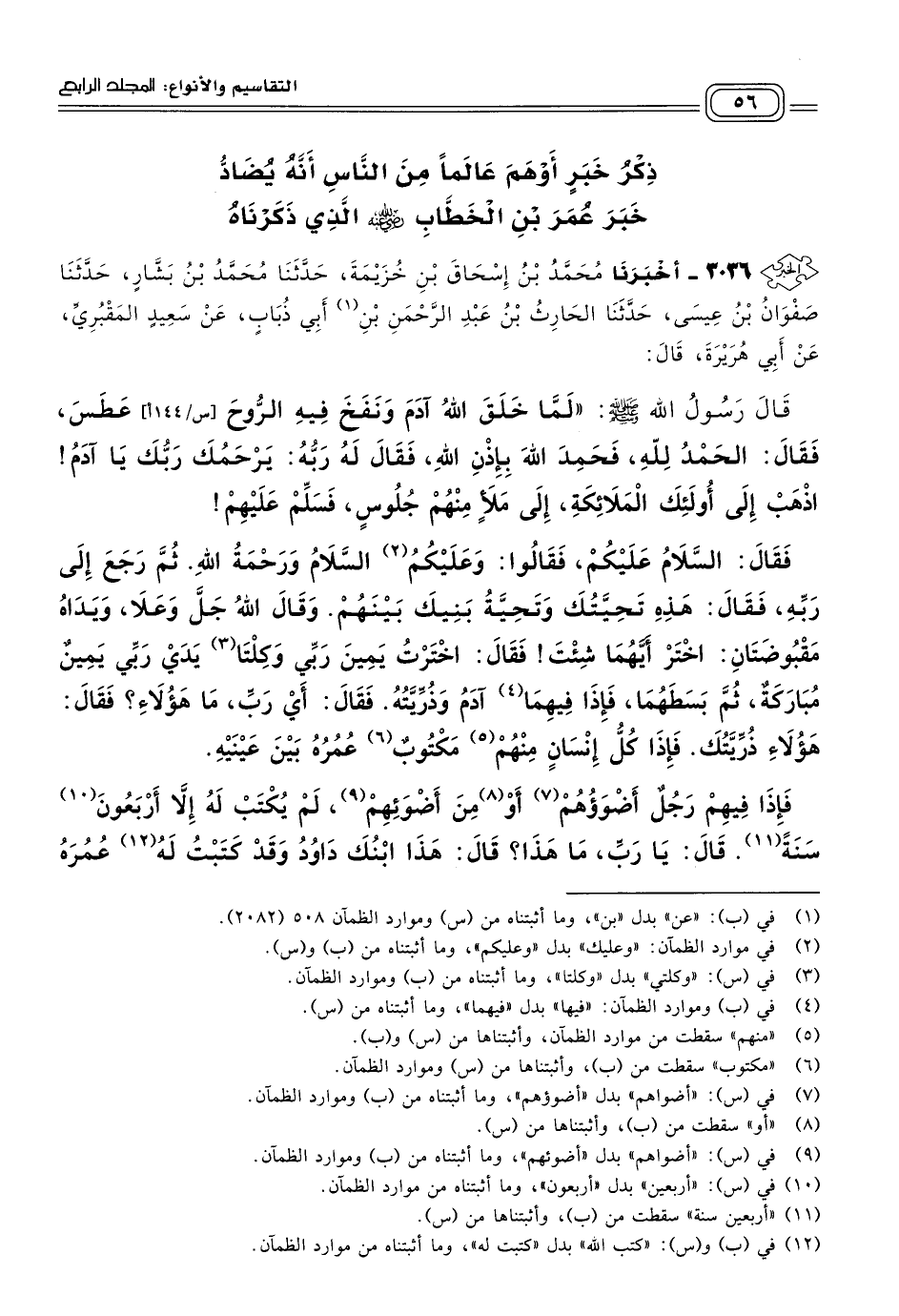 ٣٠٣٦ - أَخبَرنا مُحَمَّدُ بْنُ إِسْحَاقَ بْنِ خُزَيْمَةَ، حَدثنا مُحَمَّدُ بْنُ بَشَّارٍ، حَدثنا صَفْوَانُ بْنُ عِيسَى، حَدثنا الْحَارِثُ بْنُ عَبْدِ الرَّحْمَنِ بْنِ أَبِي ذُبَابٍ، عَنْ سَعِيدٍ الْمَقْبُرِيِّ، عَنْ أَبِي هُرَيْرَةَ، قَالَ: قَالَ رَسُولُ اللهِ صَلى الله عَلَيه وسَلم: "لَمَّا خَلَقَ اللهُ آدَمَ وَنَفَخَ فِيهِ الرُّوحَ عَطَسَ، فَقَالَ: الْحَمْدُ للهِ، فَحَمِدَ اللهَ بِإِذْنِ اللهِ، فَقَالَ لَهُ رَبُّهُ: يَرْحَمُكَ رَبُّكَ يَا آدَمُ، اذْهَبْ إِلَى أُولَئِكَ الْمَلَائِكَةِ إِلَى مَلأٍ مِنْهُمْ جُلُوسٍ، فَسَلِّمْ عَلَيْهِمْ، فَقَالَ: السَّلَامُ عَلَيْكُمْ، فَقَالُوا: وَعَلَيْكُمُ السَّلَامُ وَرَحْمَةُ اللهِ، ثُمَّ رَجَعَ إِلَى رَبِّهِ، فَقَالَ: هَذِهِ تَحِيَّتُكَ وَتَحِيَّةُ بَنِيكَ بَيْنَهُمْ،