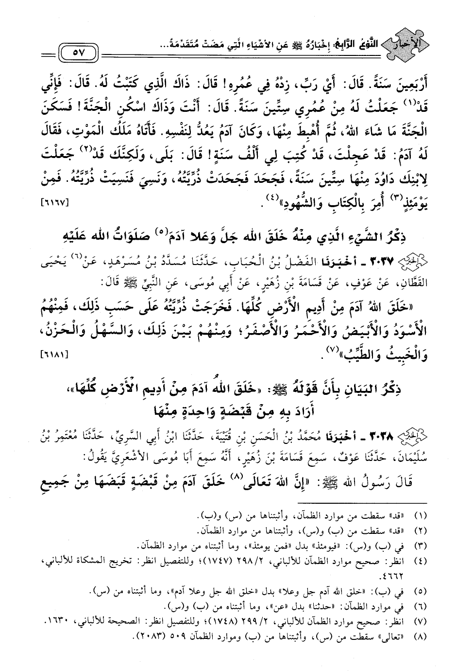وَقَالَ اللهُ جَلَّ وَعَلَا وَيَدَاهُ مَقْبُوضَتَانِ: اخْتَرْ أَيَّهُمَا شِئْتَ، فَقَالَ: اخْتَرْتُ يَمِينَ رَبِّي وَكِلْتَا يَدَيْ رَبِّي يَمِينٌ مُبَارَكَةٌ، ثُمَّ بَسَطَهُمَا فَإِذَا فِيهِمَا آدَمُ وَذُرِّيَّتُهُ، فَقَالَ: أَيْ رَبِّ مَا هَؤُلَاءِ؟ فَقَالَ: هَؤُلَاءِ ذُرِّيَّتُكَ، فَإِذَا كُلُّ إِنْسَانٍ مِنْهُمْ مَكْتُوبٌ عُمْرُهُ بَيْنَ عَيْنَيْهِ، فَإِذَا فِيهِمْ رَجُلٌ أَضْوَؤُهُمْ، أَوْ مِنْ أَضْوَئِهِمْ لَمْ يُكْتَبْ لَهُ إِلَاّ أَرْبَعُونَ سَنَةً، قَالَ: يَا رَبِّ، مَا هَذَا؟ قَالَ: هَذَا ابْنُكَ دَاوُدُ، وَقَدْ كَتَبْتُ له عُمُرَهُ أَرْبَعِينَ سَنَةً، قَالَ: أَيْ رَبِّ، زِدْهُ فِي عُمُرِهِ، قَالَ: ذَاكَ الَّذِي كَتَبْتُ لَهُ، قَالَ: فَإِنِّي قَدْ جَعَلْتُ لَهُ مِنْ عُمُرِي سِتِّينَ سَنَةً، قَالَ: أَنْتَ وَذَاكَ اسْكُنِ الْجَنَّةَ، فَسَكَنَ الْجَنَّةَ مَا شَاءَ اللهُ، ثُمَّ أُهْبِطَ مِنْهَا، وَكَانَ آدَمُ يَعُدُّ لِنَفْسِهِ، فَأَتَاهُ مَلَكُ الْمَوْتِ، فَقَالَ لَهُ آدَمُ: قَدْ عَجِلْتَ، قَدْ كُتِبَ لِي أَلْفُ سَنَةٍ، قَالَ: بَلَى، وَلَكِنَّكَ قد جَعَلْتَ لاِبْنِكَ دَاوُدَ مِنْهَا سِتِّينَ سَنَةً، فَجَحَدَ فَجَحَدَتْ ذُرِّيَّتُهُ، وَنَسِيَ فَنَسِيتْ ذُرِّيَّتُهُ، فَمن يَوْمَئِذٍ أُمِرَ بِالْكِتَابِ وَالشُّهُودِ". [٦١٦٧]