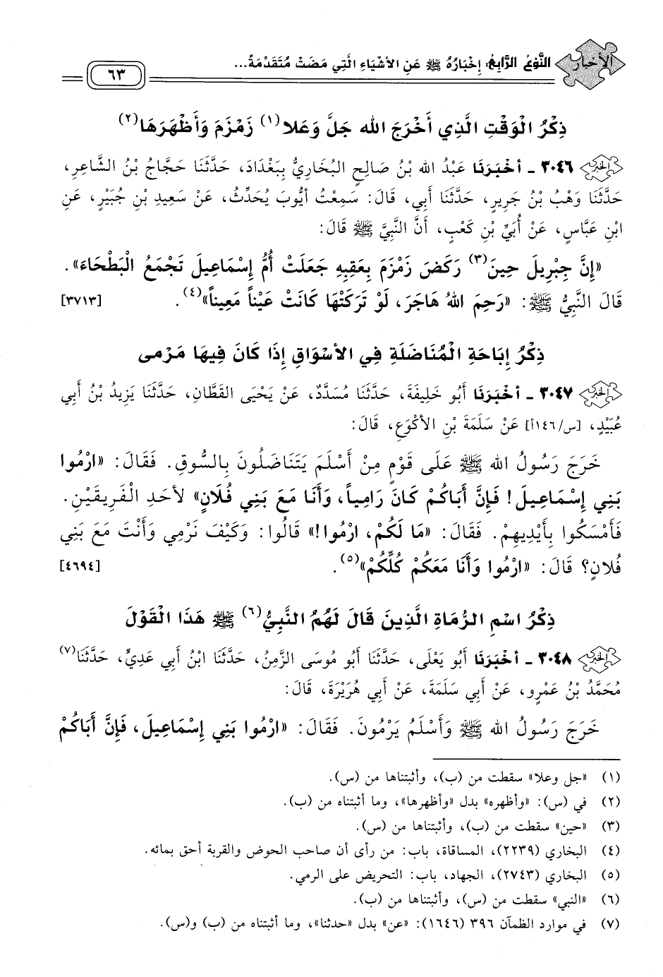٣٠٤٦ - أَخبَرنا عَبْدُ اللهِ بْنُ صَالِحٍ الْبُخَارِيُّ بِبَغْدَادَ، حَدثنا حَجَّاجُ بْنُ الشَّاعِرِ، حَدثنا وَهْبُ بْنُ جَرِيرٍ، حَدثنا أَبِي، قَالَ: سَمِعْتُ أَيُّوبَ يُحَدِّثُ عَنْ سَعِيدِ بْنِ جُبَيْرٍ، عَنِ ابْنِ عَبَّاسٍ، عَنْ أُبَيِّ بْنِ كَعْبٍ، أَنَّ النَّبِيَّ صَلى الله عَلَيه وسَلم قَالَ: "إِنَّ جِبْرِيلَ حِينَ رَكَضَ زَمْزَمَ بِعَقِبِهِ جَعَلَتْ أُمُّ إِسْمَاعِيلَ تَجْمَعُ الْبَطْحَاءَ"، قَالَ النَّبِيُّ صَلى الله عَلَيه وسَلم: "رَحِمَ اللهُ هَاجَرَ، لَوْ تَرَكَتْهَا كَانَتْ عَيْنًا مَعِينًا". [٣٧١٣]