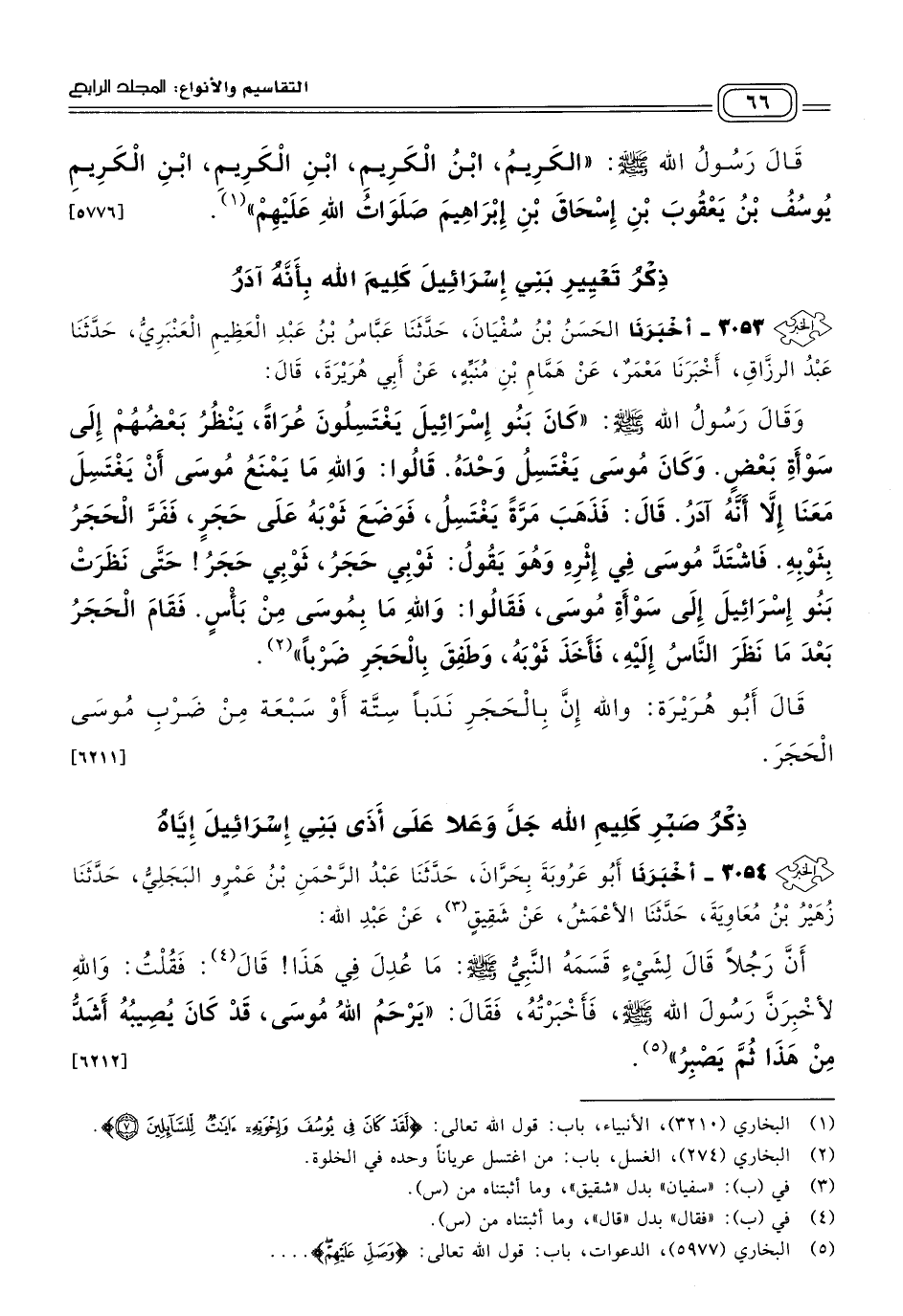 ٣٠٥٤ - أَخبَرنا أَبُو عَرُوبَةَ، بِحَرَّانَ، حَدثنا عَبْدُ الرَّحْمَنِ بْنُ عَمْرٍو الْبَجَلِيُّ، حَدثنا زُهَيْرُ بْنُ مُعَاوِيَةَ، حَدثنا الأَعْمَشُ، عَنْ شَقِيقٍ، عَنْ عَبْدِ اللهِ؛ أَنَّ رَجُلاً قَالَ لِشَيْءٍ قَسَمَهُ النَّبِيُّ صَلى الله عَلَيه وسَلم: مَا عُدِلَ فِي هَذَا، قَالَ: فَقُلْتُ: وَاللهِ لأُخْبِرَنَّ رَسُولَ اللهِ صَلى الله عَلَيه وسَلم، فَأَخْبَرْتُهُ، فَقَالَ: "يَرْحَمُ اللهُ مُوسَى، قَدْ كَانَ يُصِيبُهُ أَشَدُّ مِنْ هَذَا ثُمَّ يَصْبِرُ". [٦٢١٢]