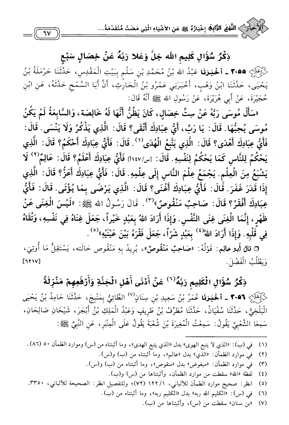 ذِكْرُ سُؤَالِ كَلِيمِ اللهِ جَلَّ وَعَلَا رَبَّهُ عَنْ خِصَالٍ سَبْعٍ.