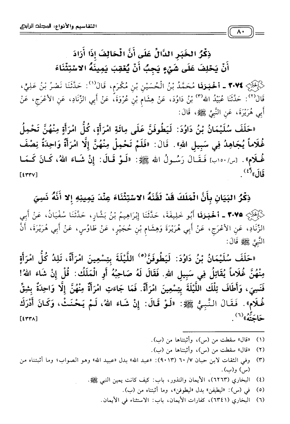 ٣٠٧٥ - أَخبَرنا أَبُو خَلِيفَةَ، حَدثنا إِبْرَاهِيمُ بْنُ بَشَّارٍ، حَدثنا سُفْيَانُ، عَنْ أَبِي الزِّنَادِ، عَنِ الأَعْرَجِ، عَنْ أَبِي هُرَيْرَةَ، وَهِشَامِ بْنِ حُجَيْرٍ، عَنْ طَاوُسٍ، عَنْ أَبِي هُرَيْرَةَ، أَنَّ النَّبِيَّ صَلى الله عَلَيه وسَلم قَالَ: "حَلَفَ سُلَيْمَانُ بْنُ دَاوُدَ: لَيَطُوفَنَّ اللَّيْلَةَ بِتِسْعِينَ امْرَأَةً تَلِدُ كُلُّ امْرَأَةٍ مِنْهُنَّ غُلَامًا يُقَاتِلُ فِي سَبِيلِ اللهِ، فَقَالَ لَهُ صَاحِبُهُ أَوِ الْمَلَكُ: قُلْ إِنْ شَاءَ اللهُ، فَنَسِيَ، وَأَطَافَ تِلْكَ اللَّيْلَةَ بِتِسْعِينَ امْرَأَةً فَمَا جَاءَتِ امْرَأَةٌ مِنْهُنَّ إِلَاّ وَاحِدَةٌ بِشِقِّ غُلَامٍ". فَقَالَ النَّبِيُّ صَلى الله عَلَيه وسَلم: "لَوْ قَالَ: إِنْ شَاءَ اللهُ لَمْ يَحْنَثْ، وَكَانَ أَدْرَكَ حَاجَتَهُ". [٤٣٣٨]