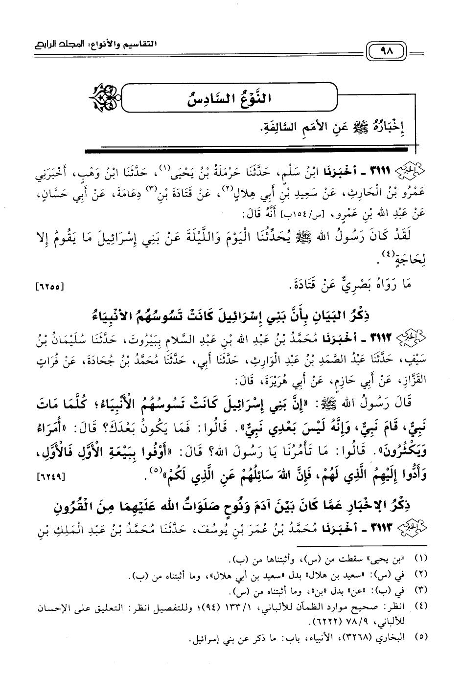 ٣١١١ - أَخبَرنا ابْنُ سَلْمٍ، حَدثنا حَرْمَلَةُ بْنُ يَحْيَى، حَدثنا ابْنُ وَهْبٍ، أَخْبَرَنِي عَمْرُو بْنُ الْحَارِثِ، عَنْ سَعِيدِ بْنِ أَبِي هِلَالٍ، عَنْ قَتَادَةَ بْنِ دِعَامَةَ، عَنْ أَبِي حَسَّانٍ، عَنْ عَبْدِ اللهِ بْنِ عَمْرٍو، أَنَّهُ قَالَ: لَقَدْ كَانَ رَسُولُ اللهِ صَلى الله عَلَيه وسَلم يُحَدِّثُنَا الْيَوْمَ وَاللَّيْلَةَ عَنْ بَنِي إِسْرَائِيلَ مَا يَقُومُ إِلَاّ لِحَاجَةٍ.
