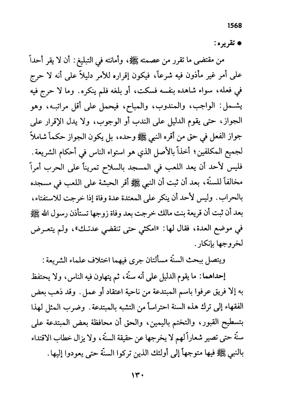 من مقتضى ما تقرر من عصمته - صلى الله عليه وسلم -، وأمانته في التبليغ: أن لا يقر أحداً على أمر غير مأذون فيه شرعاً، فيكون إقراره للأمر دليلاً على أنه لا حرج في فعله، سواء شاهده بنفسه فسكت، أو بلغه فلم ينكره. وما لا حرج فيه يشمل: الواجب، والمندوب، والمباح، فيحمل على أقل مراتبه، وهو الجواز، حتى يقوم الدليل على الندب أو الوجوب، ولا يدل الإقرار على جواز الفعل في حق من أقره النبي - صلى الله عليه وسلم - وحده، بل يكون الجواز حكماً شاملاً لجميع المكلفين؛ أخذًا بالأصل الذي هو استواء الناس في أحكام الشريعة. فليس لأحد أن يعد اللعب في المسجد بالسلاح تمرينًا على الحرب أمراً مخالفاً للسنّة، بعد أن ثبت أن النبي - صلى الله عليه وسلم - أقر الحبشة على اللعب في مسجده بالحراب. وليس لأحد أن ينكر على المعتدة عدة وفاة إذا خرجت للاستفتاء، بعد أن ثبت أن قريعة بنت مالك خرجت بعد وفاة زوجها تستأذن رسول الله - صلى الله عليه وسلم - في موضع العدة، فقال لها: "امكثي حتى تنقضي عدتك"، ولم يتعرض لخروجها بإنكار.
