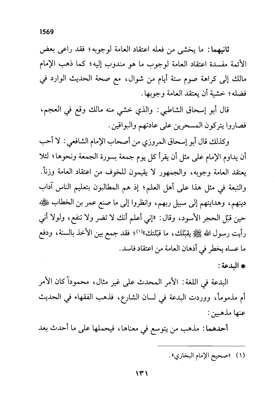 وكذلك قال أبو إسحاق المروزي من أصحاب الإِمام الشافعي: لا أحب أن يداوم الإِمام على مثل أن يقرأ كل يوم جمعة بسورة الجمعة ونحوها؛ لئلا يعتقد العامة وجوبه، والجمهور لا يقيمون للخوف من اعتقاد العامة وزنًا. والتبعة في مثل هذا على أهل العلم؛ إذ هم المطالبون بتعليم الناس آداب دينهم، وهدايتهم إلى سبيل ربهم، وانظروا إلى ما صنع عمر بن الخطاب - رضي الله عنه - حين قبّل الحجر الأسود، وقال: "إني أعلم أنك لا تضر ولا تنفع، ولولا أني رأيت رسول الله - صلى الله عليه وسلم - يقبّلك، ما قبّلت" (¬1)؛ فقد جمع بين الأخذ بالسنة، ودفع ما عساه يخطر في أذهان العامة من اعتقاد فاسد.