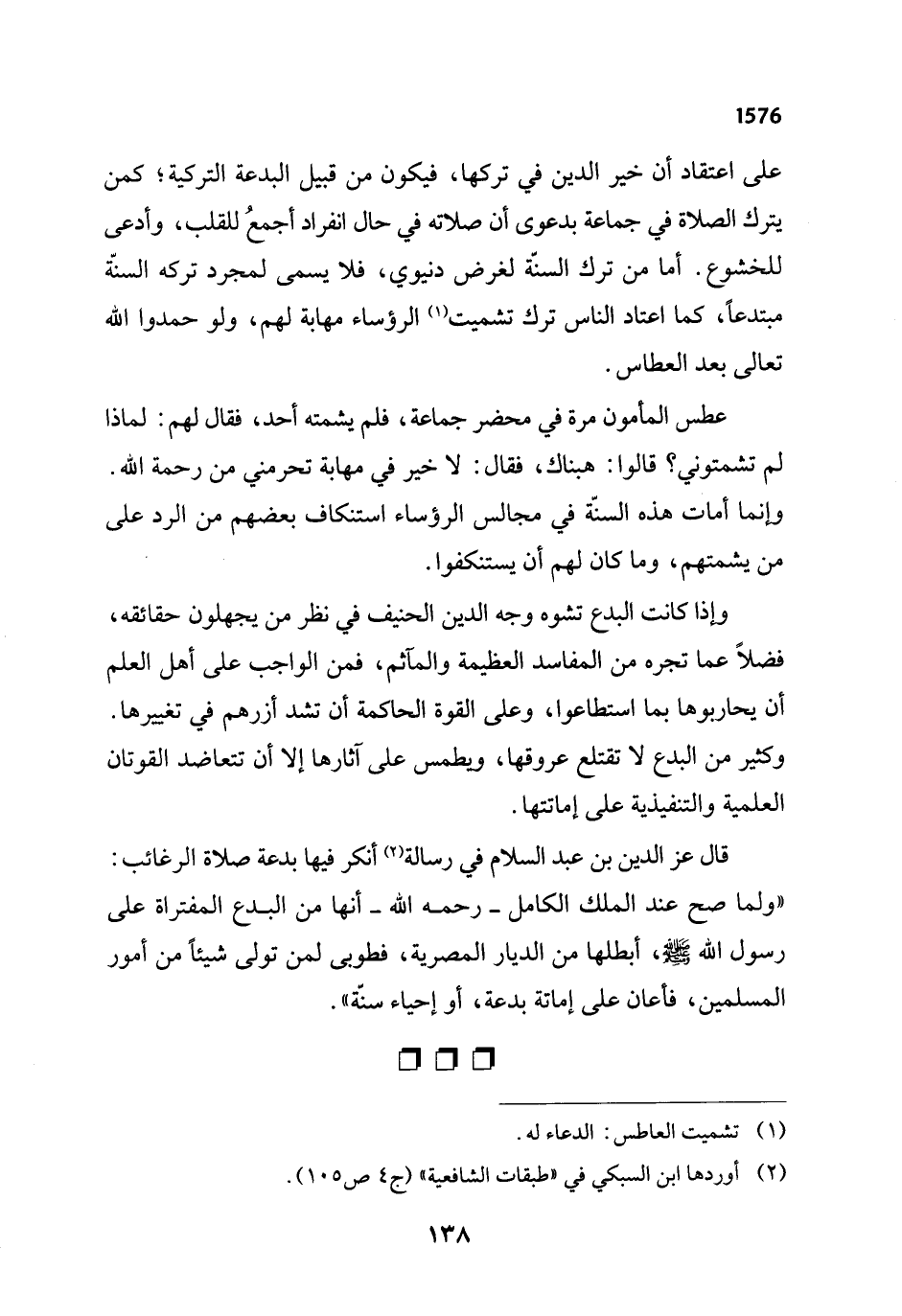 على اعتقاد أن خير الدين في تركها، فيكون من قبيل البدعة التركية؛ كمن يترك الصلاة في جماعة بدعوى أن صلاته في حال انفراد أجمعُ للقلب، وأدعى للخشوع. أما من ترك السنّة لغرض دنيوي، فلا يسمى لمجرد تركه السنّة مبتدعاً، كما اعتاد الناس ترك تشميت (¬1) الرؤساء مهابة لهم، ولو حمدوا الله تعالى بعد العطاس.