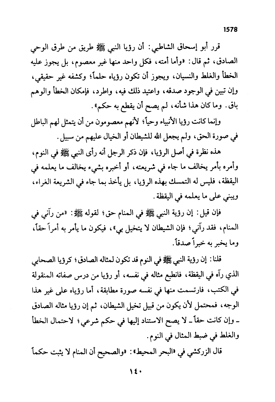 قلنا: إن رؤية النبي - صلى الله عليه وسلم - في النوم قد تكون لمثاله الصادق؛ كرؤيا الصحابي الذي رآه في اليقظة، فانطبع مثاله في نفسه، أو رؤيا من درس صفاته المنقولة في الكتب، فارتسمت منها في نفسه صورة مطابقة، أما رؤياه على غير هذا الوجه، فمحتمل لأن يكون من قبيل تخيل الشيطان، ثم إن رؤيا مثاله الصادق - وإن كانت حقاً - لا يصح الاستناد إليها في حكم شرعي؛ لاحتمال الخطأ والغلط في ضبط المثال في النوم.