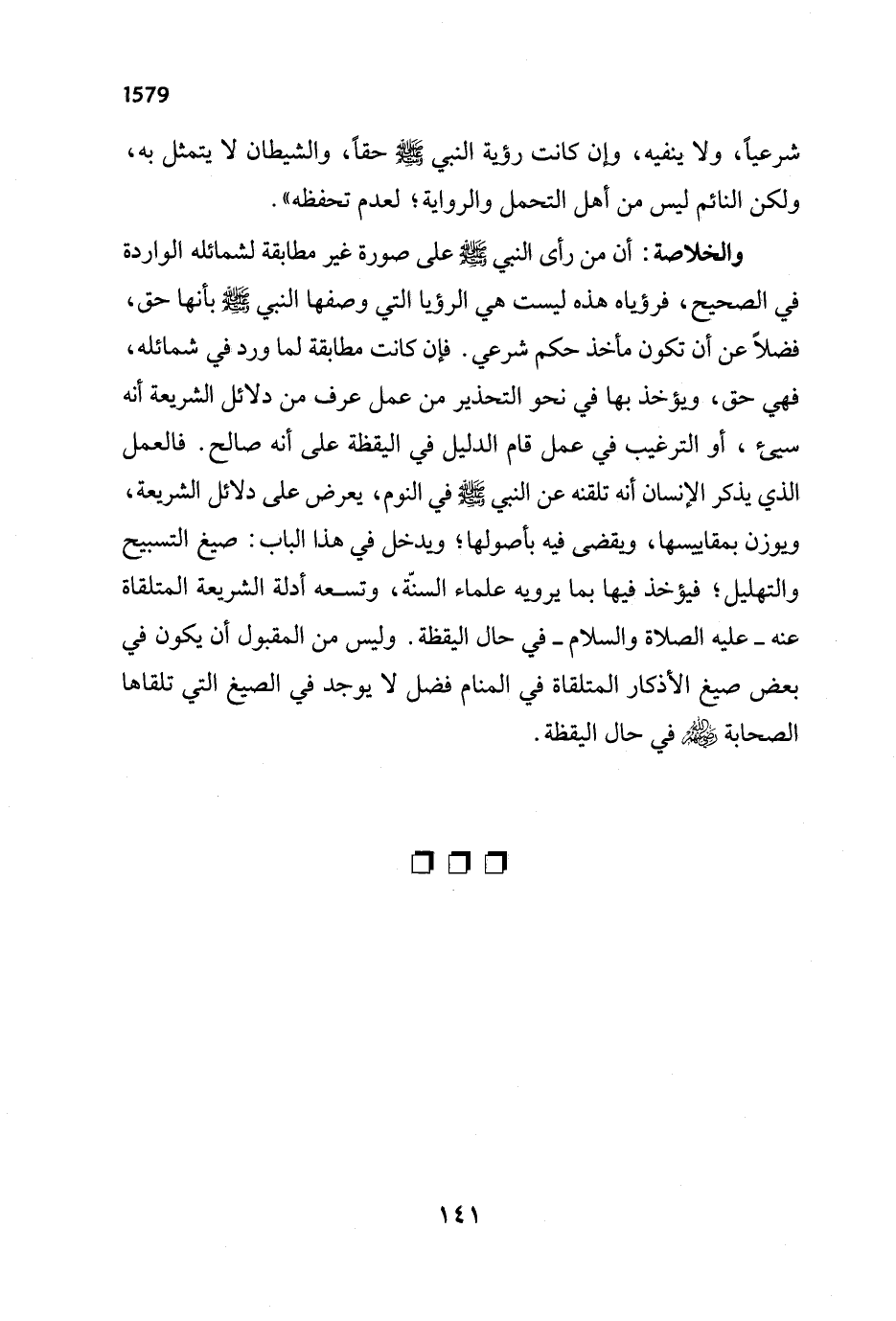 والخلاصة: أن من رأى النبي - صلى الله عليه وسلم - على صورة غير مطابقة لشمائله الواردة في اللصحيح، فرؤياه هذه ليست هي الرؤيا التي وصفها النبي - صلى الله عليه وسلم - بأنها حق، فضلاً عن أن تكون مأخذ حكم شرعي. فإن كانت مطابقة لما ورد في شمائله، فهي حق، ويؤخذ بها في نحو التحذير من عمل عرف من دلائل الشريعة أنه سيئ، أو الترغيب في عمل قام الدليل في اليقظة على أنه صالح. فالعمل الذي يذكر الإنسان أنه تلقنه عن النبي - صلى الله عليه وسلم - في النوم، يعرض على دلائل الشريعة، ويوزن بمقاييسها، ويقضى فيه بأصولها؛ ويدخل في هذا الباب: صيغ التسبيح والتهليل؛ فيؤخذ فيها بما يرويه علماء السنّة، وتسعه أدلة الشريعة المتلقاة عنه - عليه الصلاة والسلام - في حال اليقظة. وليس من المقبول أن يكون في بعض صيغ الأذكار المتلقاة في المنام فضل لا يوجد في الصيغ التي تلقاها الصحابة - رضي الله عنهم - في حال اليقظة.