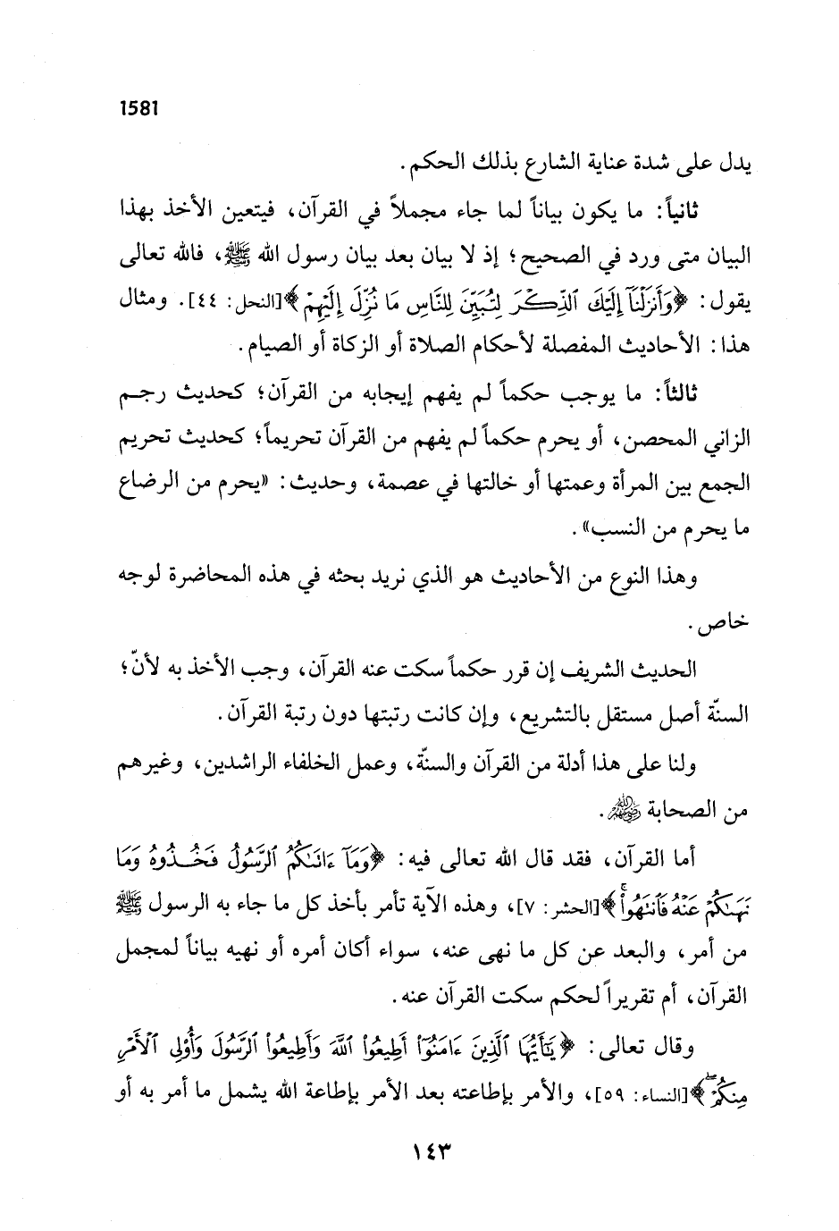 الحديث الشريف إن قرر حكماً سكت عنه القرآن، وجب الأخذ به لأنّ؛ السنّة أصل مستقل بالتشريع، وإن كانت رتبتها دون رتبة القرآن.