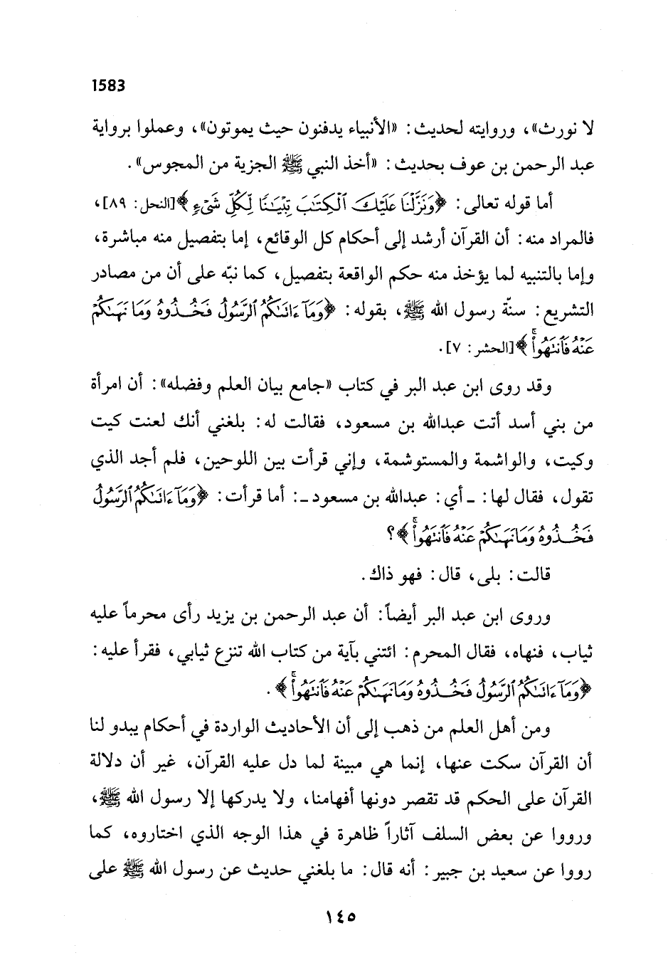 وقد روى ابن عبد البر في كتاب "جامع بيان العلم وفضله": أن امرأة من بني أسد أتت عبد الله بن مسعود، فقالت له: بلغني أنك لعنت كيت وكيت، والواشمة والمستوشمة، وإني قرأت بين اللوحين، فلم أجد الذي تقول، فقال لها: -أي: عبد الله بن مسعود-: أما قرأت: {وَمَا آتَاكُمُ الرَّسُولُ فَخُذُوهُ وَمَا نَهَاكُمْ عَنْهُ فَانْتَهُوا}؟