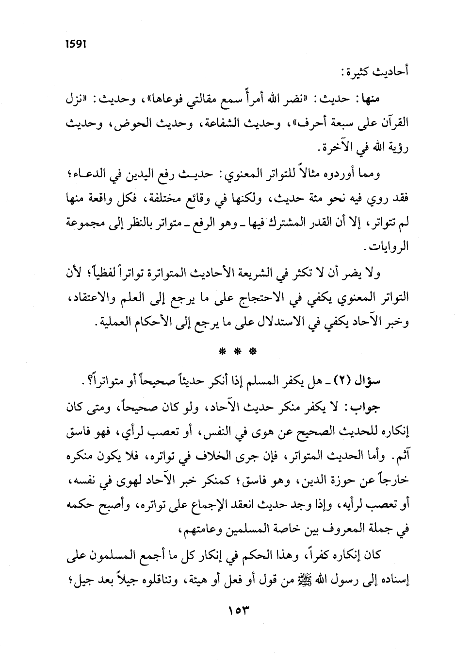 سؤال (2) - هل يكفر المسلم إذا أنكر حديثاً صحيحاً أو متواتراً؟.