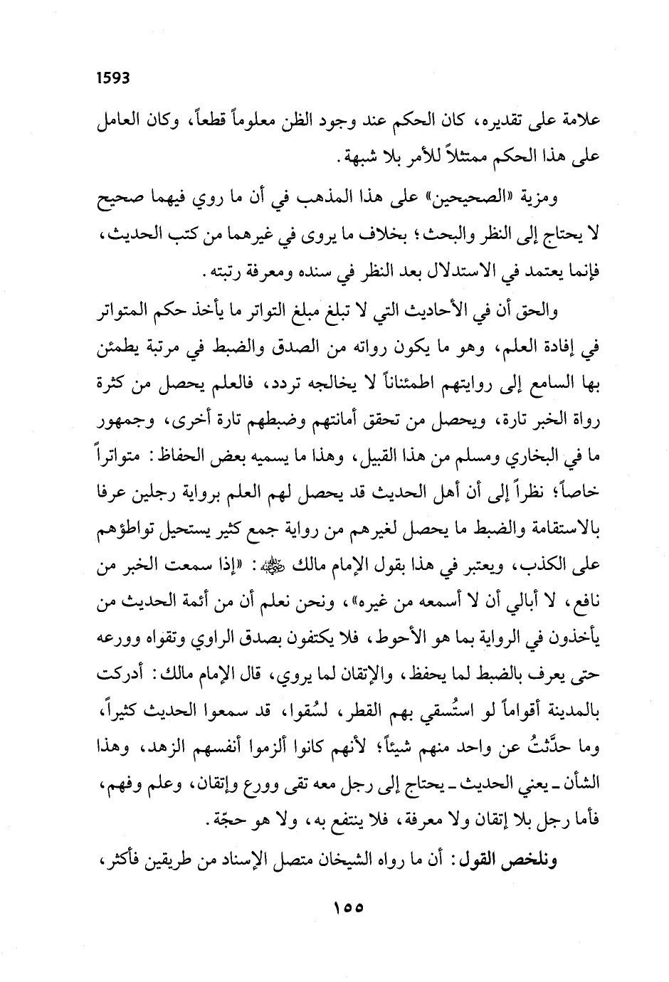 والحق أن في الأحاديث التي لا تبلغ مبلغ التواتر ما يأخذ حكم المتواتر في إفادة العلم، وهو ما يكون رواته من الصدق والضبط في مرتبة يطمئن بها السامع إلى روايتهم اطمئنانًا لا يخالجه تردد، فالعلم يحصل من كثرة رواة الخبر تارة، ويحصل من تحقق أمانتهم وضبطهم تارة أخرى، وجمهور ما في البخاري ومسلم من هذا القبيل، وهذا ما يسميه بعض الحفاظ: متواتراً خاصًا؛ نظراً إلى أن أهل الحديث قد يحصل لهم العلم برواية رجلين عرفا بالاستقامة والضبط ما يحصل لغيرهم من رواية جمع كثير يستحيل تواطؤهم على الكذب، ويعتبر في هذا يقول الإمام مالك - رضي الله عنه -: "إذا سمعت الخبر من نافع، لا أبالي أن لا أسمعه من غيره"، ونحن نعلم أن من أئمة الحديث من يأخذون في الرواية بما هو الأحوط، فلا يكتفون بصدق الراوي وتقواه وورعه حتى يعرف بالضبط لما يحفظ، والإتقان لما يروي، قال الإمام مالك: أدركت بالمدينة أقواماً لو استُسقي بهم القطر، لسُقوا، قد سمعوا الحديث كثيراً، وما حدَّثتُ عن واحد منهم شيئاً؛ لأنهم كانوا ألزموا أنفسهم الزهد، وهذا الشأن -يعني الحديث- يحتاج إلى رجل معه تقى وورع وإتقان، وعلم وفهم، فأما رجل بلا إتقان ولا معرفة، فلا ينتفع به، ولا هو حجّة.