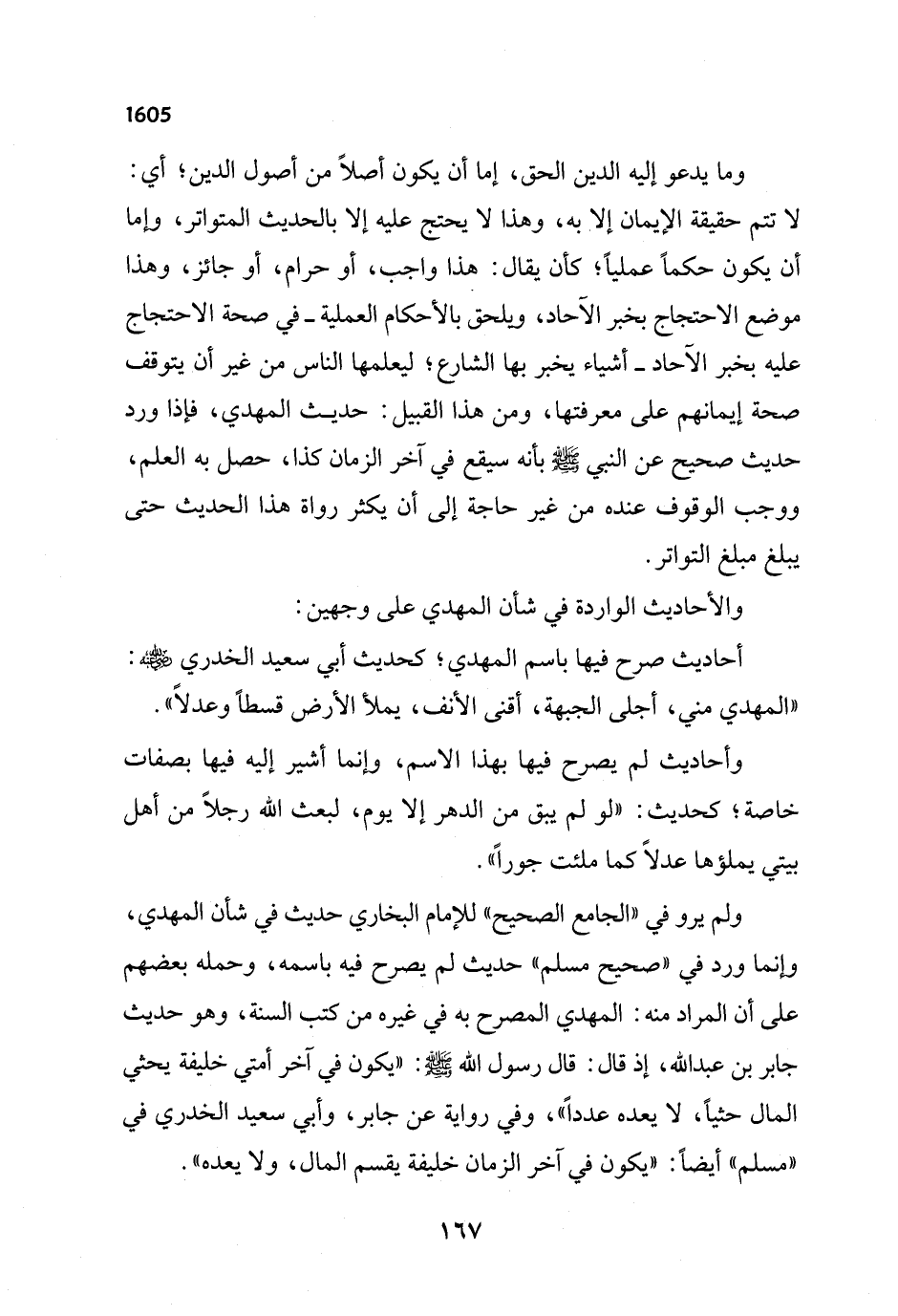 وما يدعو إليه الدين الحق، إما أن يكون أصلاً من أصول الدين؛ أي: لا تتم حقيقة الإيمان إلا به، وهذا لا يحتج عليه إلا بالحديث المتواتر، وإما أن يكون حكماً عملياً؛ كأن يقال: هذا واجب، أو حرام، أو جائز، وهذا موضع الاحتجاج بخبر الآحاد، ويلحق بالأحكام العملية - في صحة الاحتجاج عليه بخبر الآحاد - أشياء يخبر بها الشارع؛ ليعلمها الناس من غير أن يتوقف صحة إيمانهم على معرفتها، ومن هذا القبيل: حديث المهدي، فإذا ورد حديث صحيح عن النبي - صلى الله عليه وسلم - بأنه سيقع في آخر الزمان كذا، حصل به العلم، ووجب الوقوف عنده من غير حاجة إلى أن يكثر رواة هذا الحديث حتى يبلغ مبلغ التواتر.