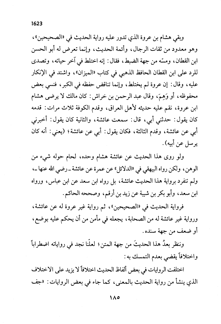 وبقي هشام بن عروة الذي تدور عليه رواية الحديث في "الصحيحين"، وهو معدود من ثقات الرجال، وأئمة الحديث، وإنما تعرض له أبو الحسن ابن القطان، ومسّه من جهة الضبط، فقال: إنه اختلط في آخر حياته، وتصدى للرد على ابن القطان الحافظ الذهبي في كتاب "الميزان"، واشتد في الإنكار عليه، وقال: إن عروة لم يختلط، وإنما تناقض حفظه في الكبر، فنسي بعض محفوظه، أو وَهِمَ، وقال عبد الرحمن بن خراش: كان مالك لا يرضى هشام ابن عروة، نقم عليه حديثه لأهل العراق، وقدم الكوفة ثلاث مرات: قدمه كان يقول: حدثني أبي، قال: سمعت عائشة، والثانية كان يقول: أخبرني أبي عن عائشة، وقدم الثالثة، فكان يقول: أبي عن عائشة؛ (يعني: أنه كان يرسل عن أبيه).
