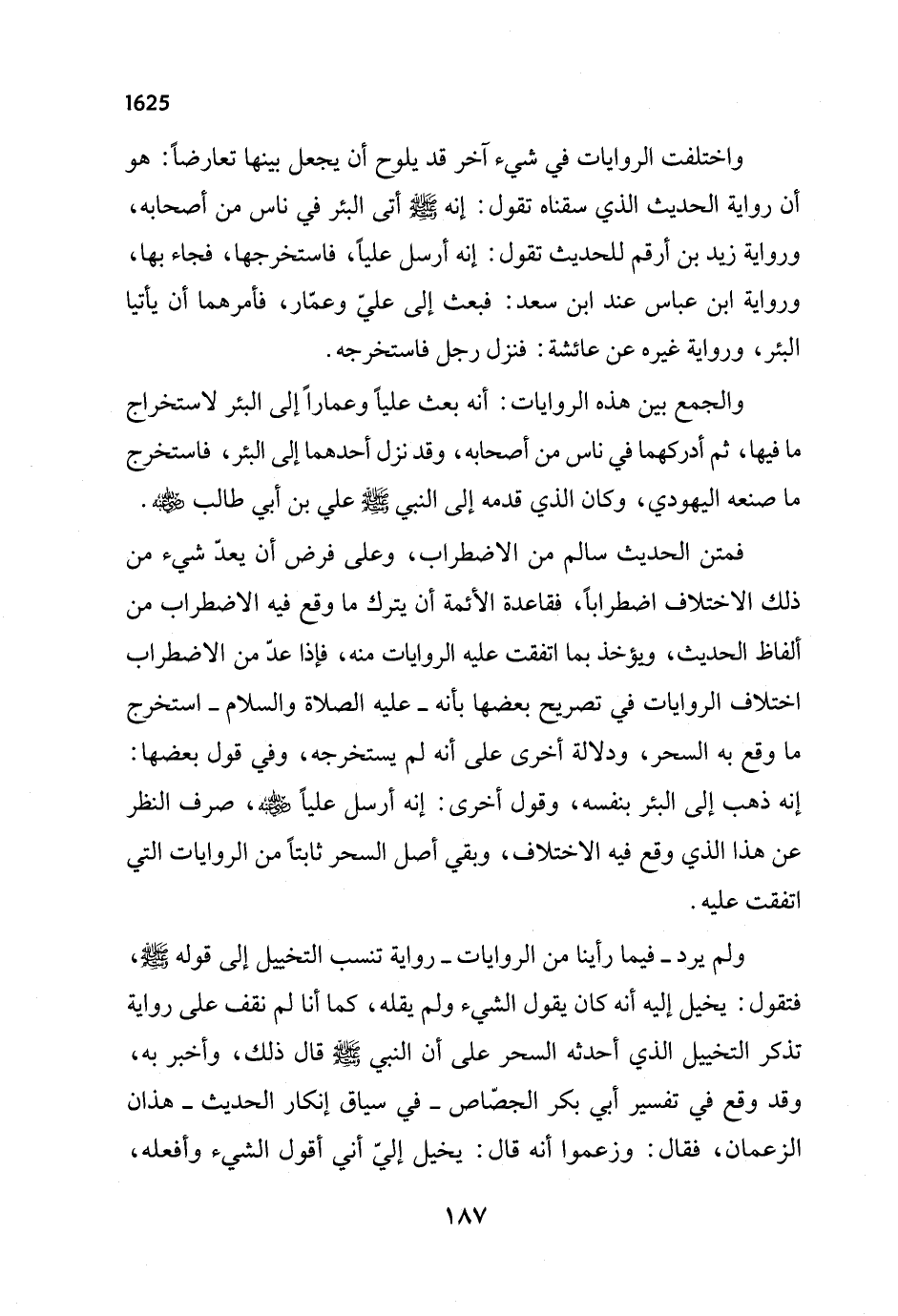 فمتن الحديث سالم من الاضطراب، وعلى فرض أن يعدّ شيء من ذلك الاختلاف اضطرابًا، فقاعدة الأئمة أن يترك ما وقع فيه الاضطراب من ألفاظ الحديث، ويؤخذ بما اتفقت عليه الروايات منه، فإذا عدّ من الاضطراب اختلاف الروايات في تصريح بعضها بأنه - عليه الصلاة والسلام - استخرج ما وقع به السحر، ودلالة أخرى على أنه لم يستخرجه، وفي قول بعضها: إنه ذهب إلى البئر بنفسه، وقول أخرى: إنه أرسل علياً - رضي الله عنه -، صرف النظر عن هذا الذي وقع فيه الاختلاف، وبقي أصل السحر ثابتاً من الروايات التي اتفقت عليه.
