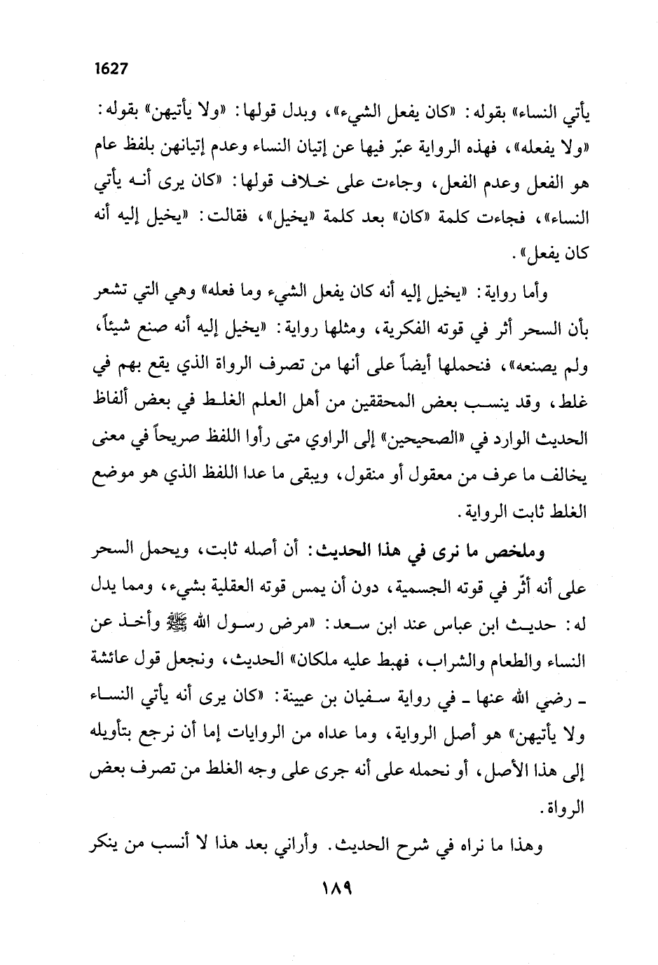 وملخص ما نرى في هذا الحديث: أن أصله ثابت، ويحمل السحر على أنه أثّر في قوته الجسمية، دون أن يمس قوته العقلية بشيء، ومما يدل له: حديث ابن عباس عند ابن سعد: "مرض رسول الله - صلى الله عليه وسلم - وأخذ عن النساء والطعام والشراب، فهبط عليه ملكان" الحديث، ونجعل قول عائشة -رضي الله عنها - في رواية سفيان بن عيينة: "كان يرى أنه يأتي النساء ولا يأتيهن " هو أصل الرواية, وما عداه من الروايات إما أن نرجع بتأويله إلى هذا الأصل، أو نحمله على أنه جرى على وجه الغلط من تصرف بعض الرواة.