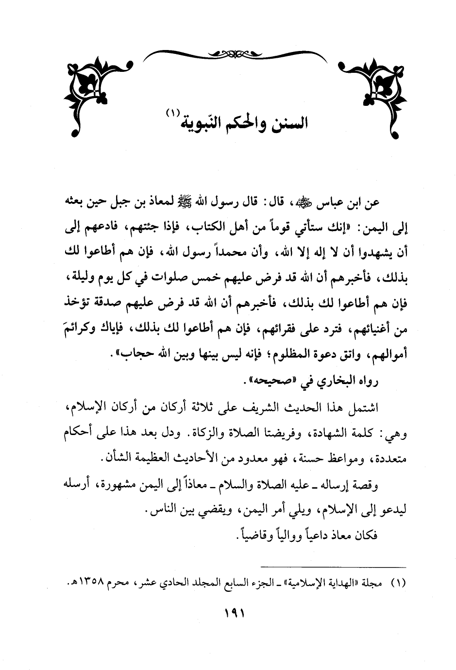 عن ابن عباس - رضي الله عنهم -، قال: قال رسول الله - صلى الله عليه وسلم - لمعاذ بن جبل حين بعثه إلى اليمن: "إنك ستأتي قوماً من أهل الكتاب، فإذا جئتهم، فادعهم إلى أن يشهدوا أن لا إله إلا الله، وأن محمداً رسول الله، فإن هم أطاعوا لك بذلك، فأخبرهم أن الله قد فرض عليهم خمس صلوات في كل يوم وليلة، فإن هم أطاعوا لك بذلك، فأخبرهم أن الله قد فرض عليهم صدقة تؤخذ من أغنيائهم، فترد على فقرائهم، فإن هم أطاعوا لك بذلك، فإياك وكرائمَ أموالهم، واتق دعوة المظلوم؛ فإنه ليس بينها وبين الله حجاب".