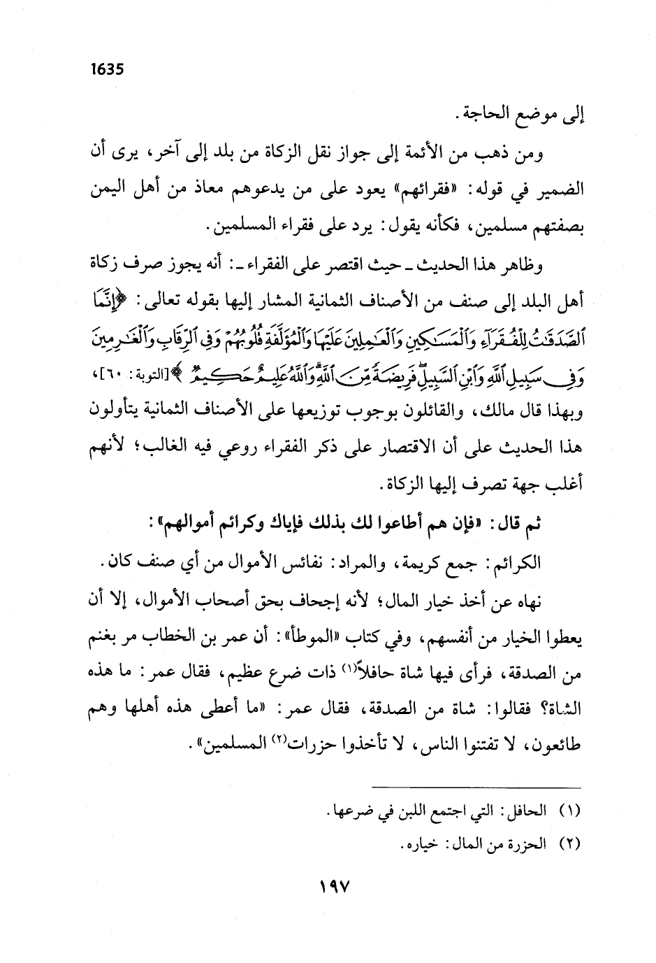 ومن ذهب من الأئمة إلى جواز نقل الزكاة من بلد إلى آخر، يرى أن الضمير في قوله: "فقرائهم" يعود على من يدعوهم معاذ من أهل اليمن بصفتهم مسلمين، فكأنه يقول: يرد على فقراء المسلمين.