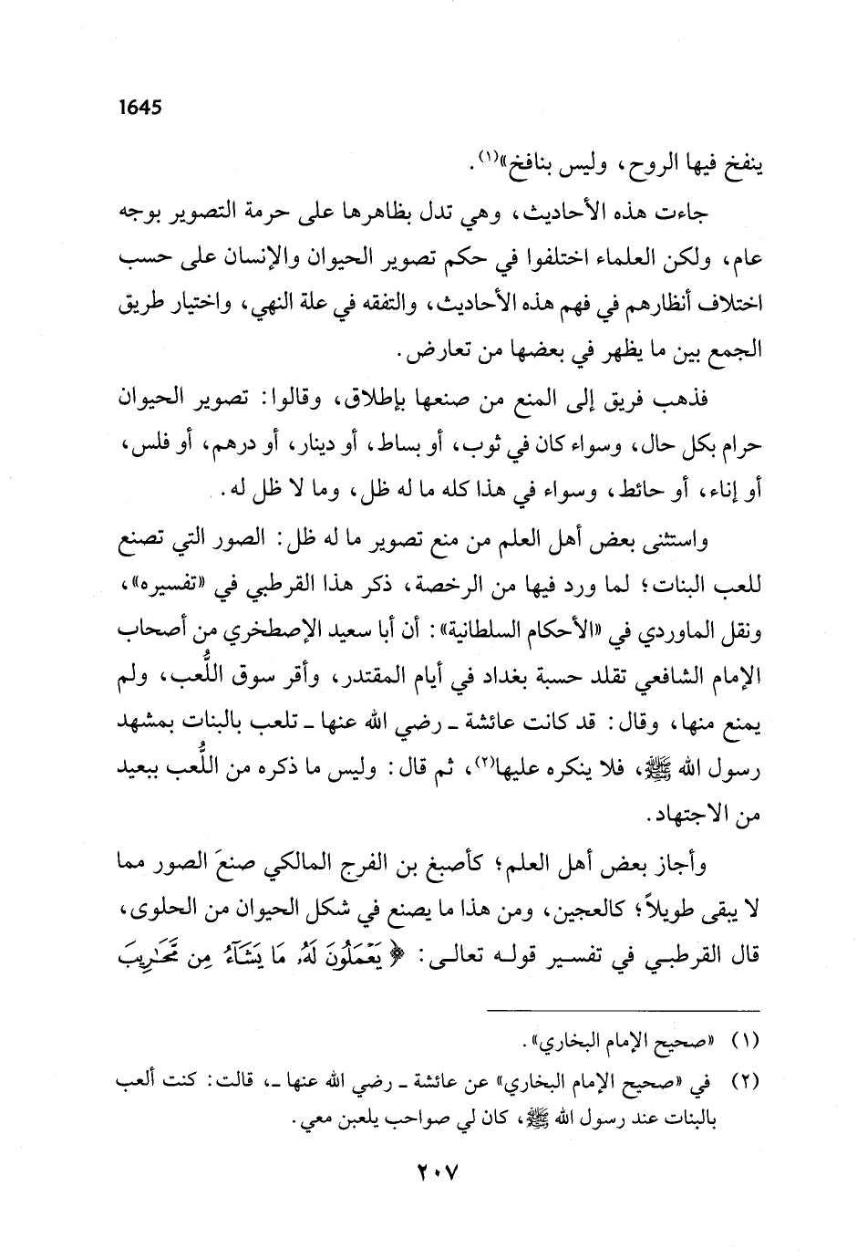 واستثنى بعض أهل العلم من منع تصوير ما له ظل: الصور التي تصنع للعب البنات؛ لما ورد فيها من الرخصة، ذكر هذا القرطبي في "تفسيره"، ونقل الماوردي في "الأحكام السلطانية": أن أبا سعيد الإصطخري من أصحاب الإِمام الشافعي تقلد حسبة بغداد في أيام المقتدر، وأقر سوق اللُّعب، ولم يمنع منها، وقال: قد كانت عائشة - رضي الله عثها - تلعب بالبنات بمشهد رسول الله - صلى الله عليه وسلم -، فلا ينكره عليها (¬2)، ثم قال: وليس ما ذكره من اللُّعب ببعيد من الاجتهاد.