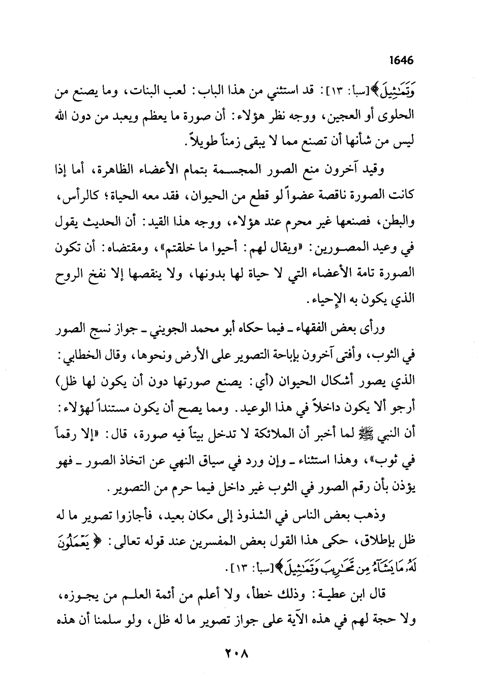 قال ابن عطية: وذلك خطأ، ولا أعلم من أئمة العلم من يجوزه، ولا حجة لهم في هذه الآية على جواز تصوير ما له ظل، ولو سلمنا أن هذه