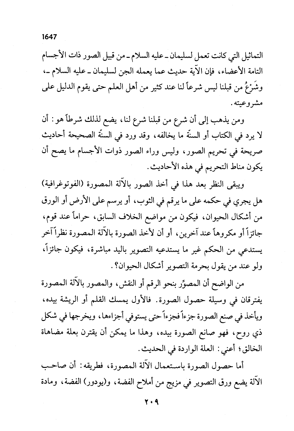 ومن يذهب إلى أن شرع من قبلنا شرع لنا، يضع لذلك شرطاً هو: أن لا يرد في الكتاب أو السنّة ما يخالفه، وقد ورد في السنّة الصحيحة أحاديث صريحة في تحريم الصور، وليس وراء الصور ذوات الأجسام ما يصح أن يكون مناط التحريم في هذه الأحاديث.