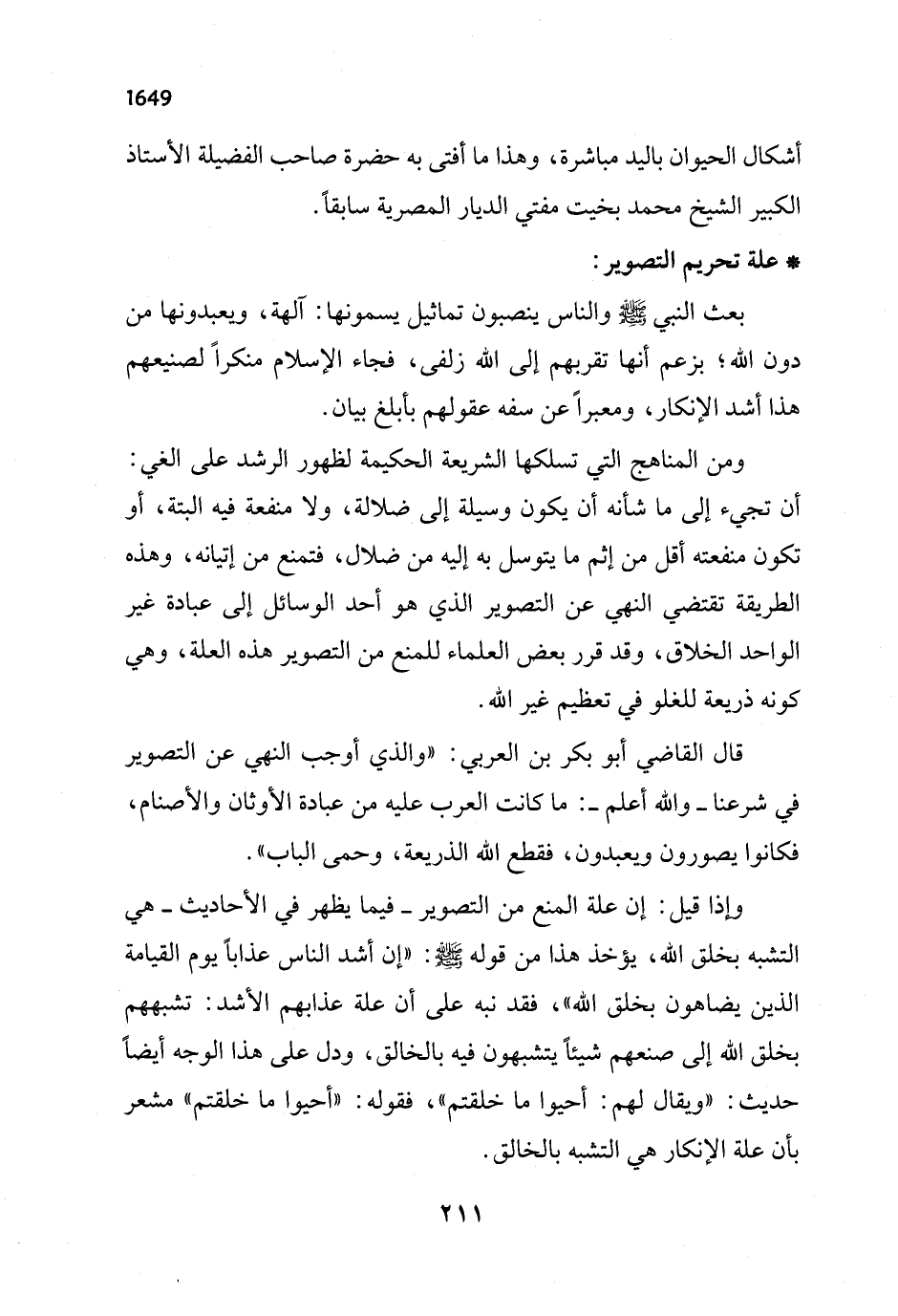 وإذا قيل: إن علة المنع من التصوير - فيما يظهر في الأحاديث - هي التشبه بخلق الله، يؤخذ هذا من قوله - صلى الله عليه وسلم -: "إن أشد الناس عذاباً يوم القيامة الذين يضاهون بخلق الله"، فقد نبه على أن علة عذابهم الأشد: تشبههم بخلق الله إلى صنعهم شيئاً يتشبهون فيه بالخالق، ودل على هذا الوجه أيضاً حديث: "ويقال لهم: أحيوا ما خلقتم"، فقوله: "أحيوا ما خلقتم" مشعر بأن علة الإنكار هي التشبه بالخالق.